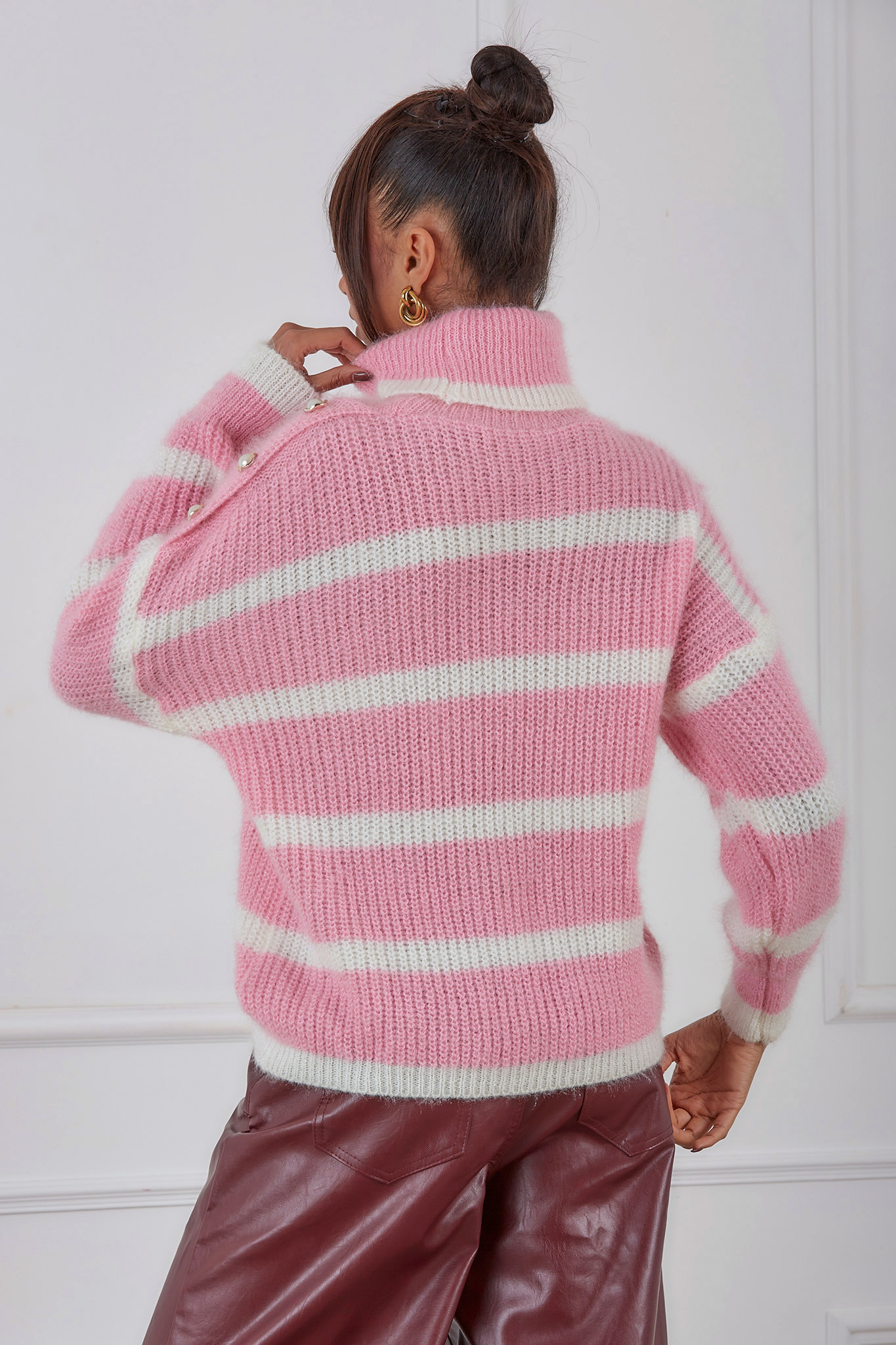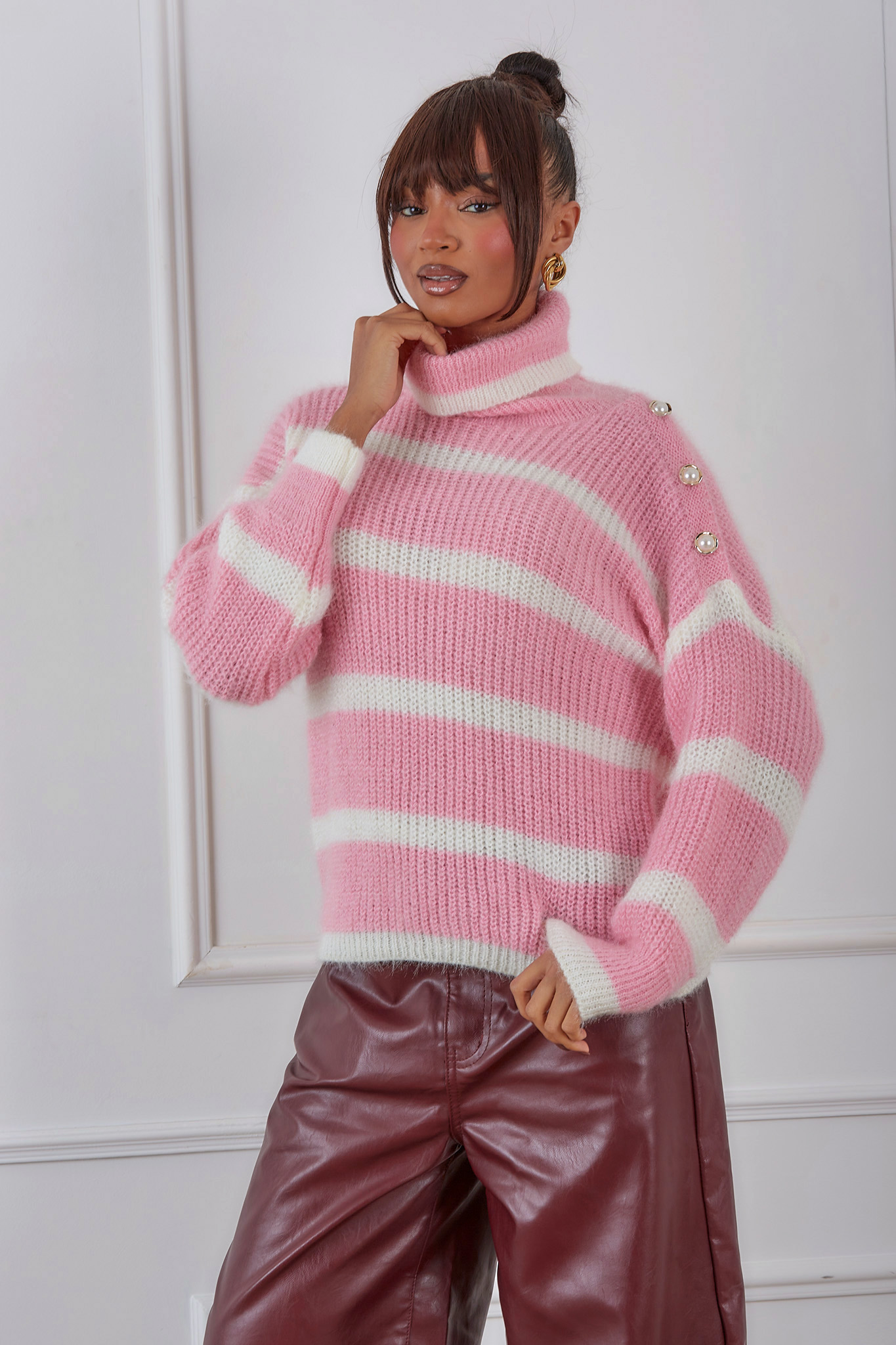 Ανανεώστε το στυλ σας με αυτό το υπέροχο πλεκτό πουλόβερ σε ροζ και λευκές οριζόντιες ρίγες, ιδανικό για άνεση και κομψότητα στις καθημερινές σας εμφανίσεις. Κατασκευασμένο από μαλακή και ζεστή πλέξη, προσφέρει ευχάριστη αίσθηση στο δέρμα και διατηρεί τη θερμότητα τις πιο κρύες μέρες. Η χαλαρή του γραμμή και ο ψηλός γιακάς προσδίδουν μοντέρνα πινελιά, ενώ οι απαλοί τόνοι το καθιστούν εύκολο να συνδυαστεί με τζιν, φούστες ή παντελόνια για ένα ολοκληρωμένο casual look.
