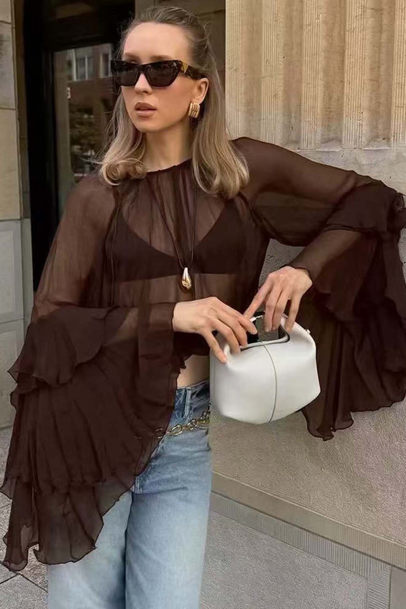 Μπλούζα διαφάνεια με έντονο βολάν στα μανίκια. ’νετη γραμμή. Προσφέρει ένα iconic αποτέλεσμα. Ιδανική επιλογή για night out εμφανίσεις.