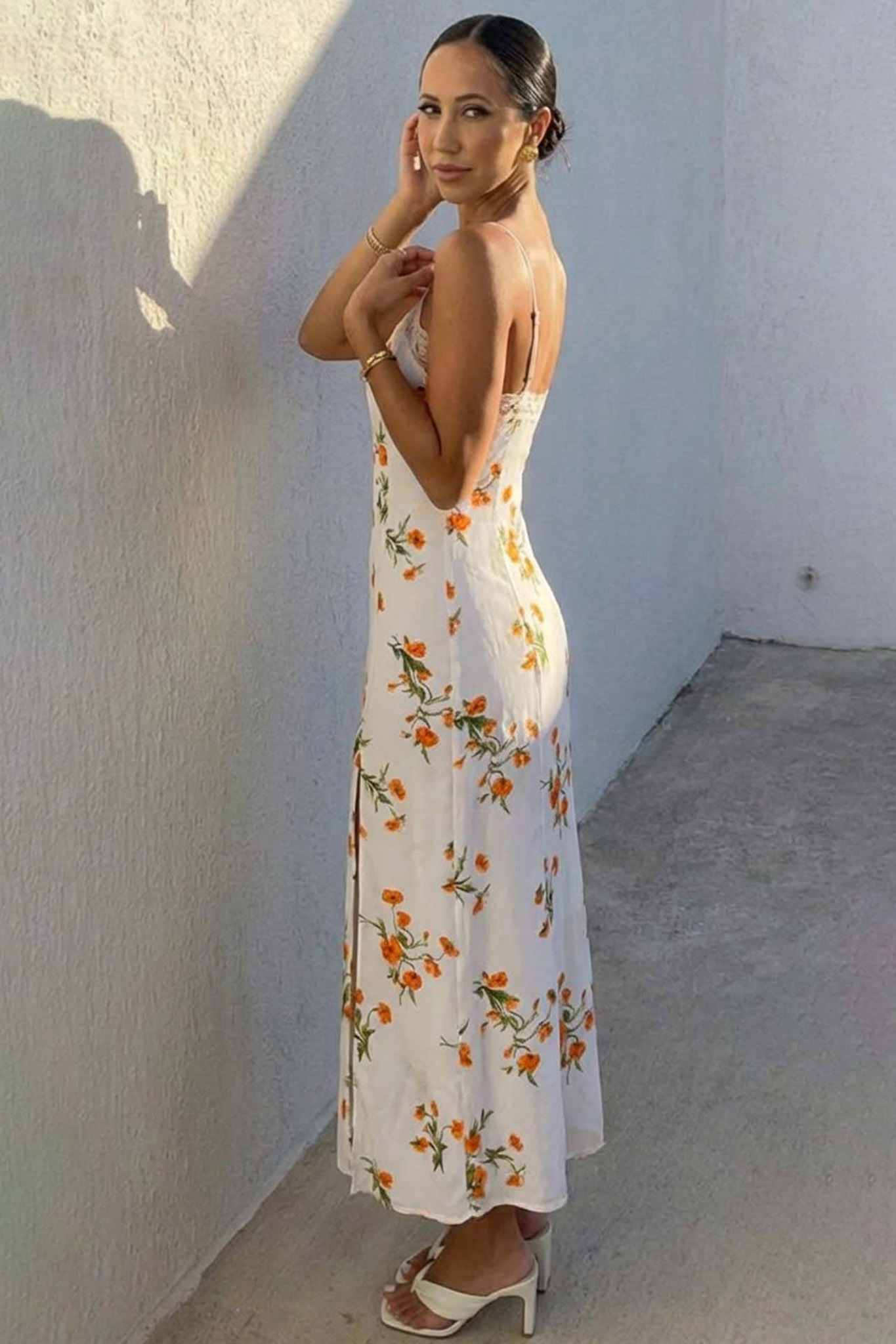 Μάξι φόρεμα φλοράλ με δαντέλα στο μπούστο και σκίσιμο στο πλάι που προσδίδει μια κομψή διάθεση.