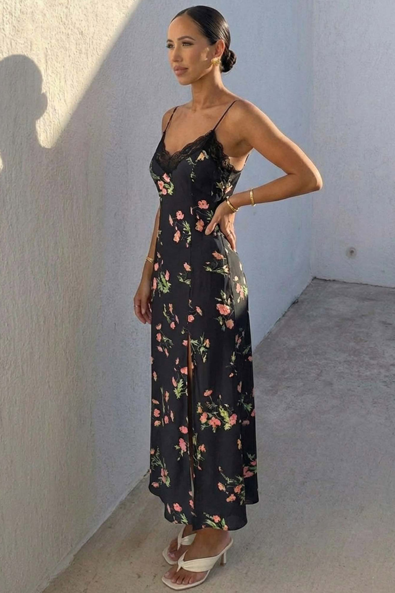 Μάξι φόρεμα φλοράλ με δαντέλα στο μπούστο και σκίσιμο στο πλάι που προσδίδει μια κομψή διάθεση.