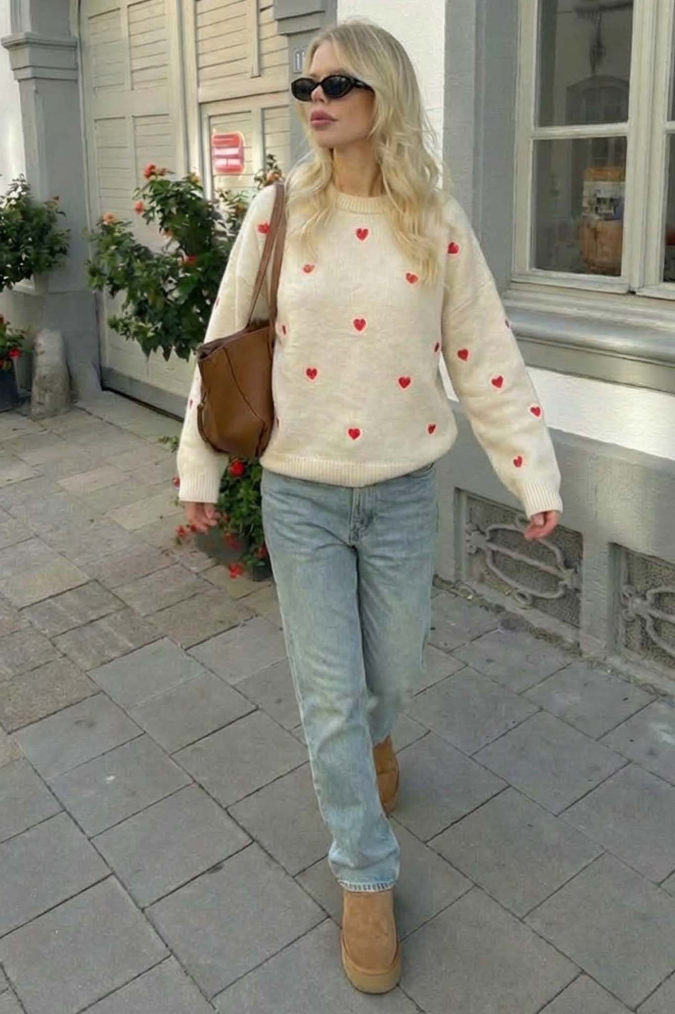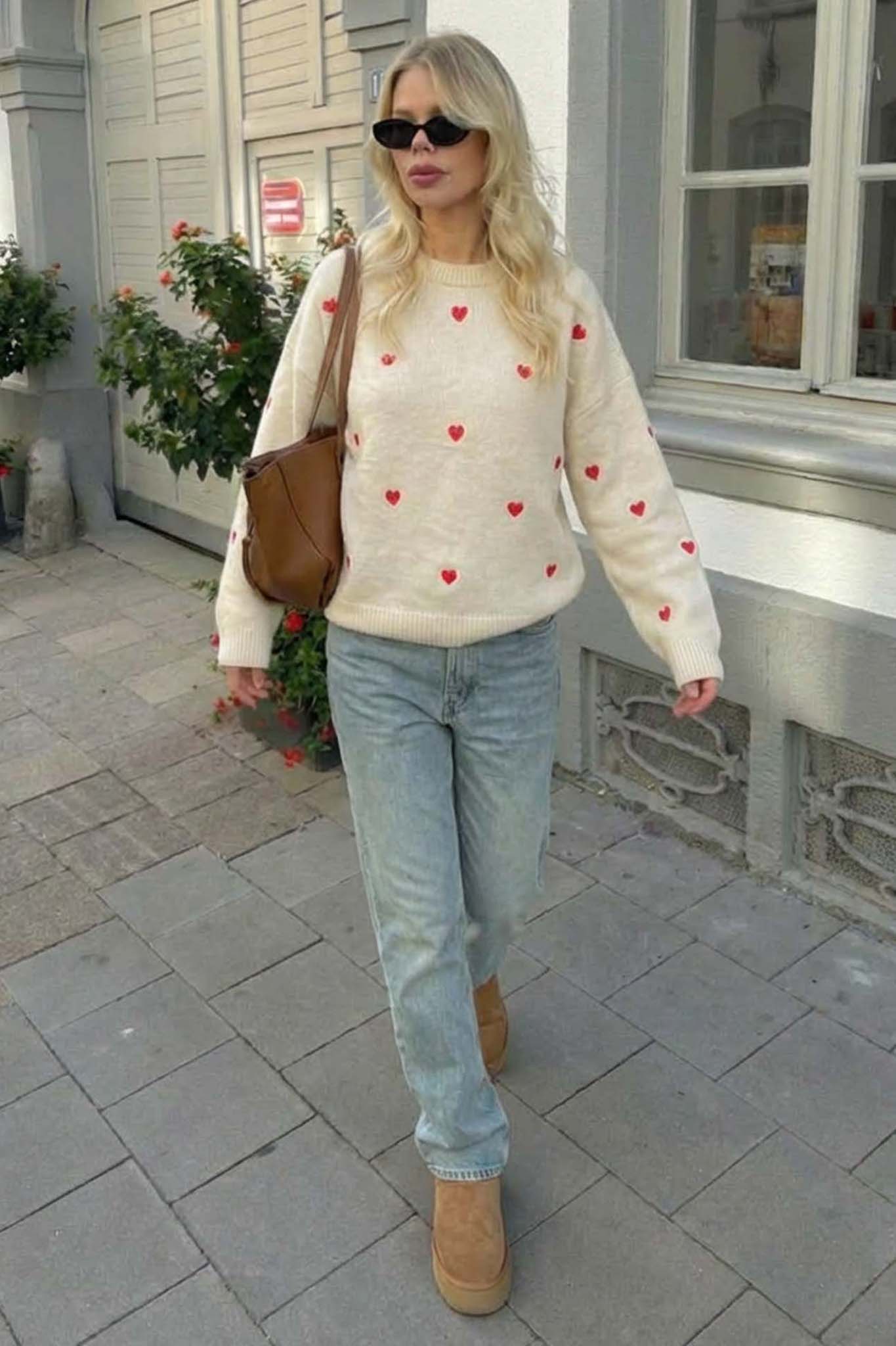 Ανανεώστε το στυλ σας με αυτό το υπέροχο πλεκτό πουλόβερ διακοσμημένο με μικρές κόκκινες καρδιές σε όλη την επιφάνεια. Κατασκευασμένο από μαλακό και άνετο ύφασμα, προσφέρει ζεστασιά και κομψότητα για τις καθημερινές σας εμφανίσεις. Διαθέτει στρογγυλή λαιμόκοψη, μακριά μανίκια και χαλαρή εφαρμογή που ταιριάζει σε κάθε σωματότυπο. Ιδανικό για να το συνδυάσετε με τζιν ή φούστα για ένα χαριτωμένο και θηλυκό look.