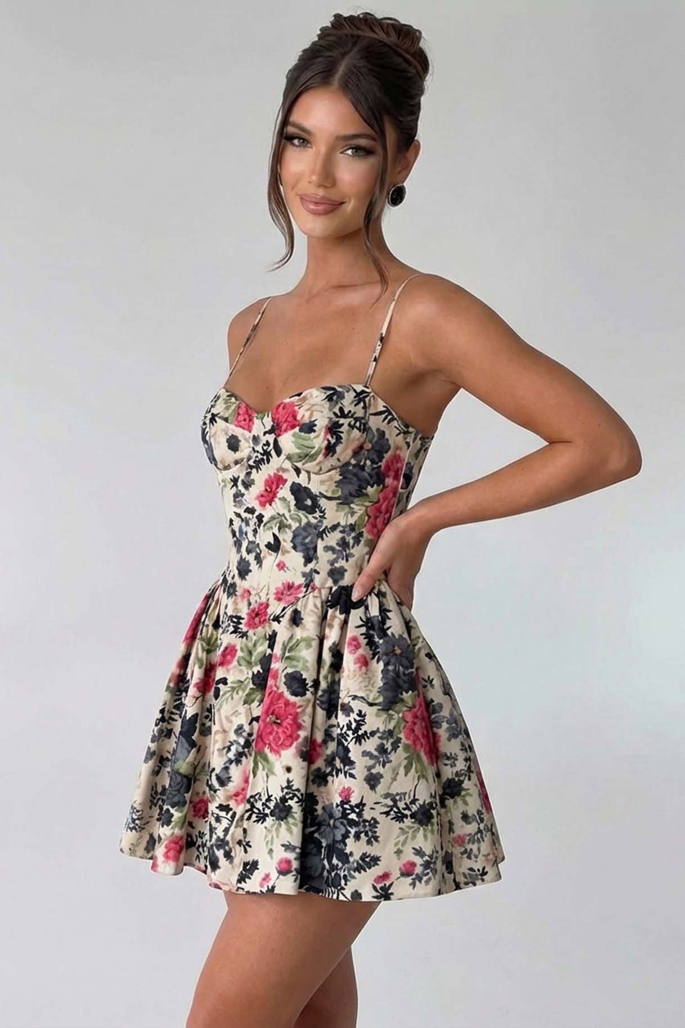 Φλοράλ Μίνι Φόρεμα με Μπούστο Κορσέ & Ρυθμιζόμενες Τιράντες. Εφαρμοστή μέση που αναδεικνύει τη σιλουέτα, η οποία καταλήγει σε μια ελαφρώς εβαζέ (A-line) φούστα με πιέτες για κίνηση και αέρινο στυλ.