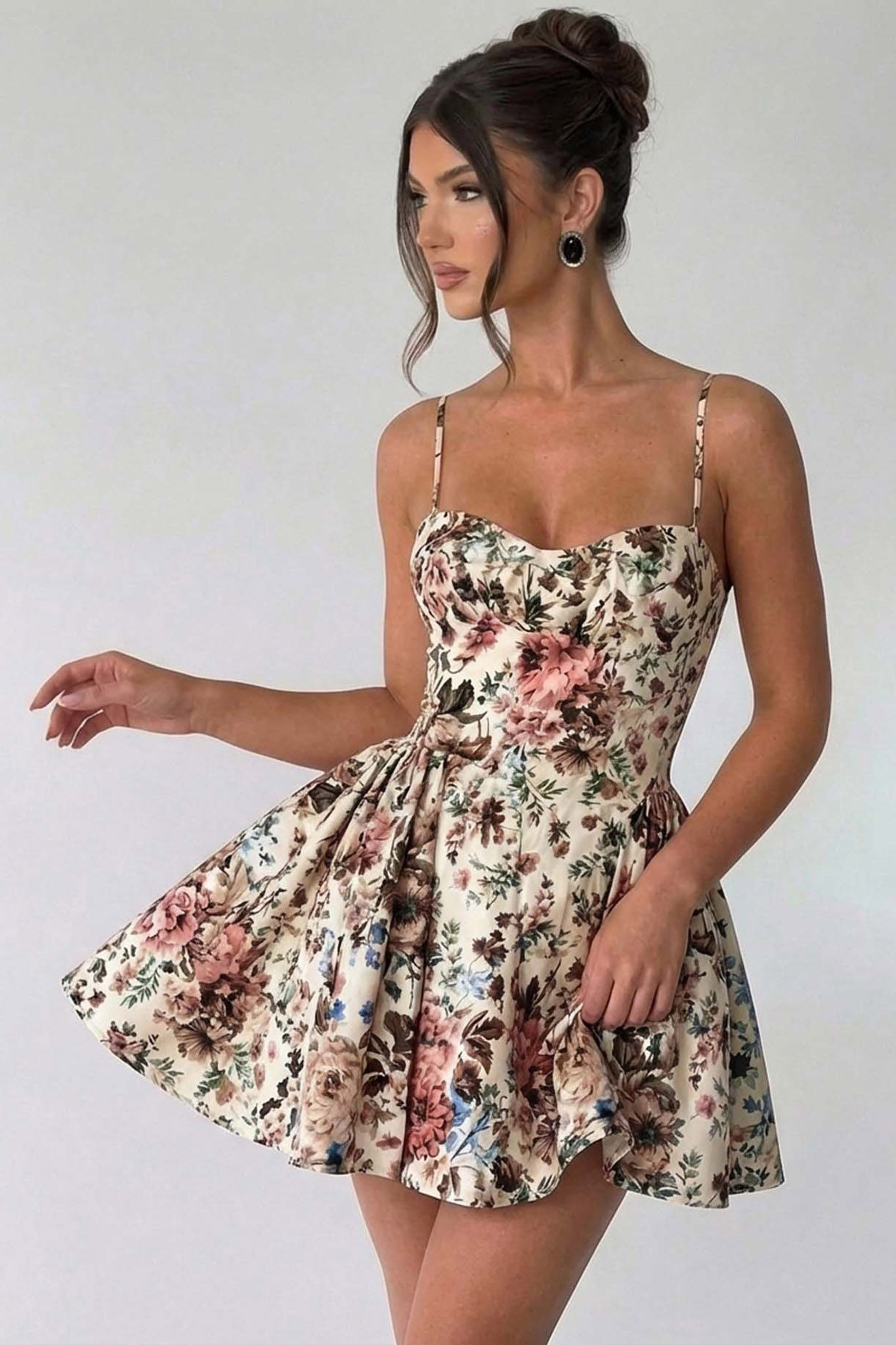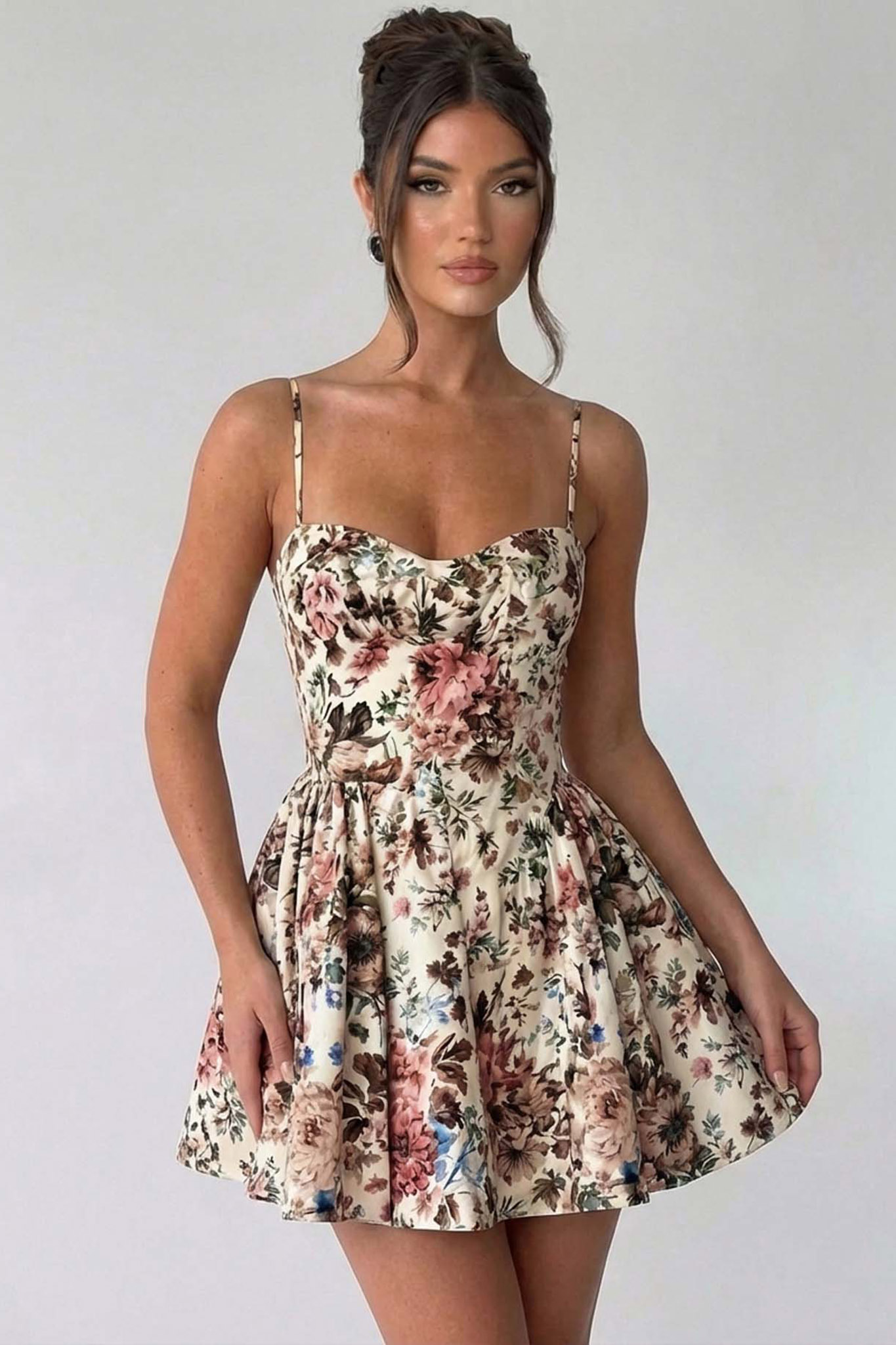Φλοράλ Μίνι Φόρεμα με Μπούστο Κορσέ & Ρυθμιζόμενες Τιράντες. Εφαρμοστή μέση που αναδεικνύει τη σιλουέτα, η οποία καταλήγει σε μια ελαφρώς εβαζέ (A-line) φούστα με πιέτες για κίνηση και αέρινο στυλ.