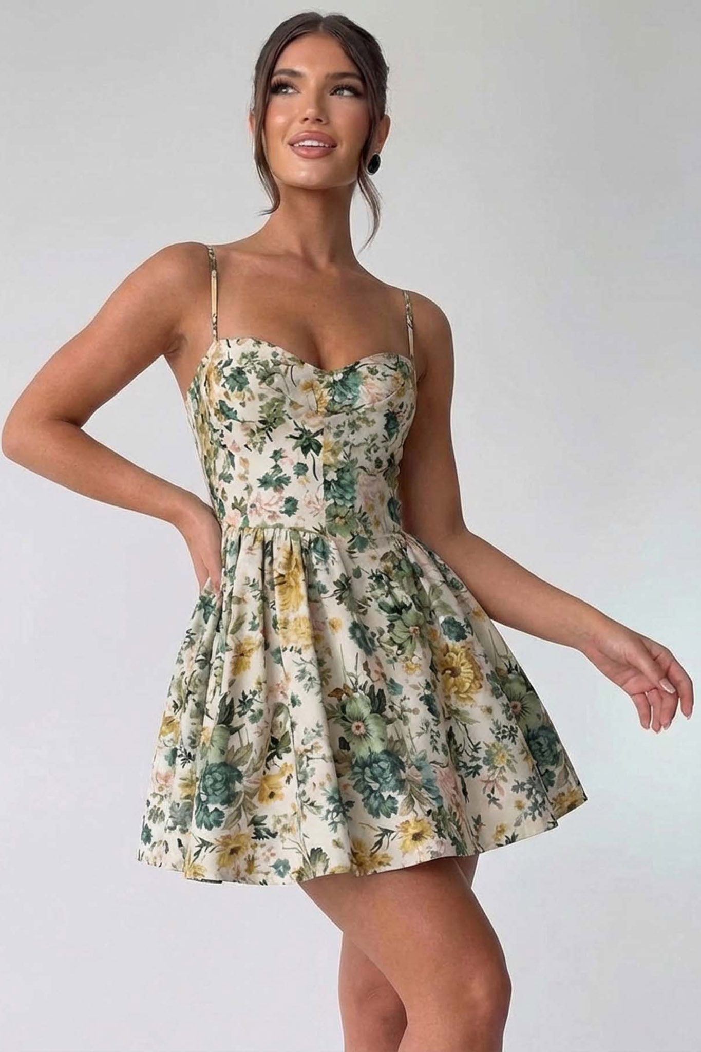 Φλοράλ Μίνι Φόρεμα με Μπούστο Κορσέ & Ρυθμιζόμενες Τιράντες. Εφαρμοστή μέση που αναδεικνύει τη σιλουέτα, η οποία καταλήγει σε μια ελαφρώς εβαζέ (A-line) φούστα με πιέτες για κίνηση και αέρινο στυλ.
