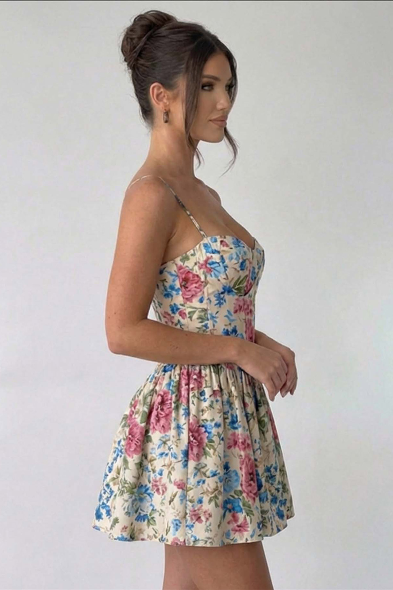 Φλοράλ Μίνι Φόρεμα με Μπούστο Κορσέ & Ρυθμιζόμενες Τιράντες. Εφαρμοστή μέση που αναδεικνύει τη σιλουέτα, η οποία καταλήγει σε μια ελαφρώς εβαζέ (A-line) φούστα με πιέτες για κίνηση και αέρινο στυλ.
