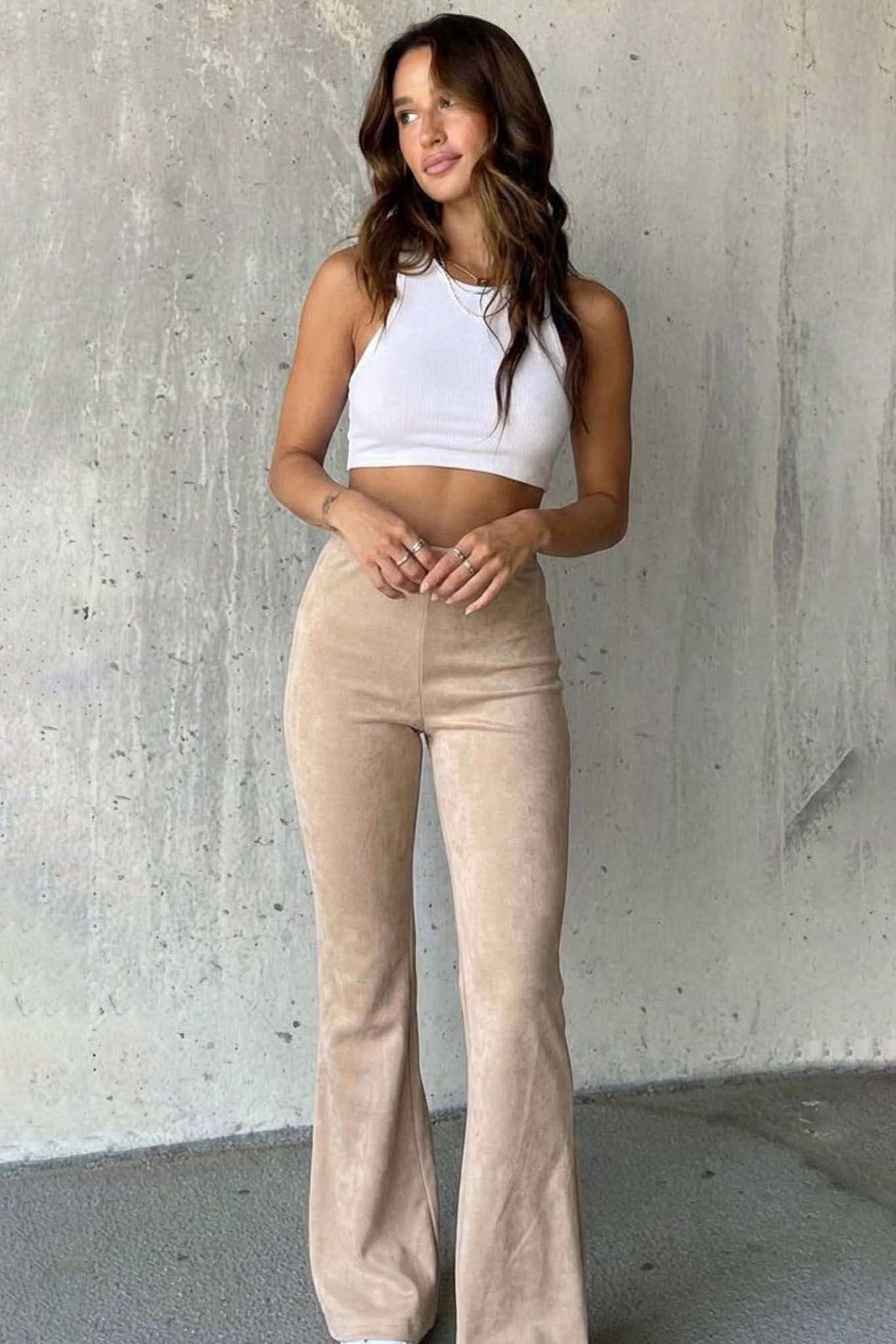 Ελαστικό παντελόνι καμπάνα με όψη σουέντ είναι η ιδανική επιλογή για να συνδυάσετε την άνεση με το στυλ. Διαθέτει ψηλόμεση εφαρμογή που κολακεύει τη σιλουέτα και ελαστική μέση για απόλυτη ελευθερία κινήσεων όλη μέρα. Μήκος 107cm, μέση 35cm.