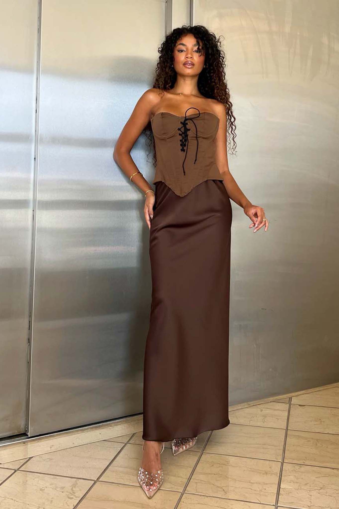 Lumenμακριά φούστα με όψη σατέν καφέ