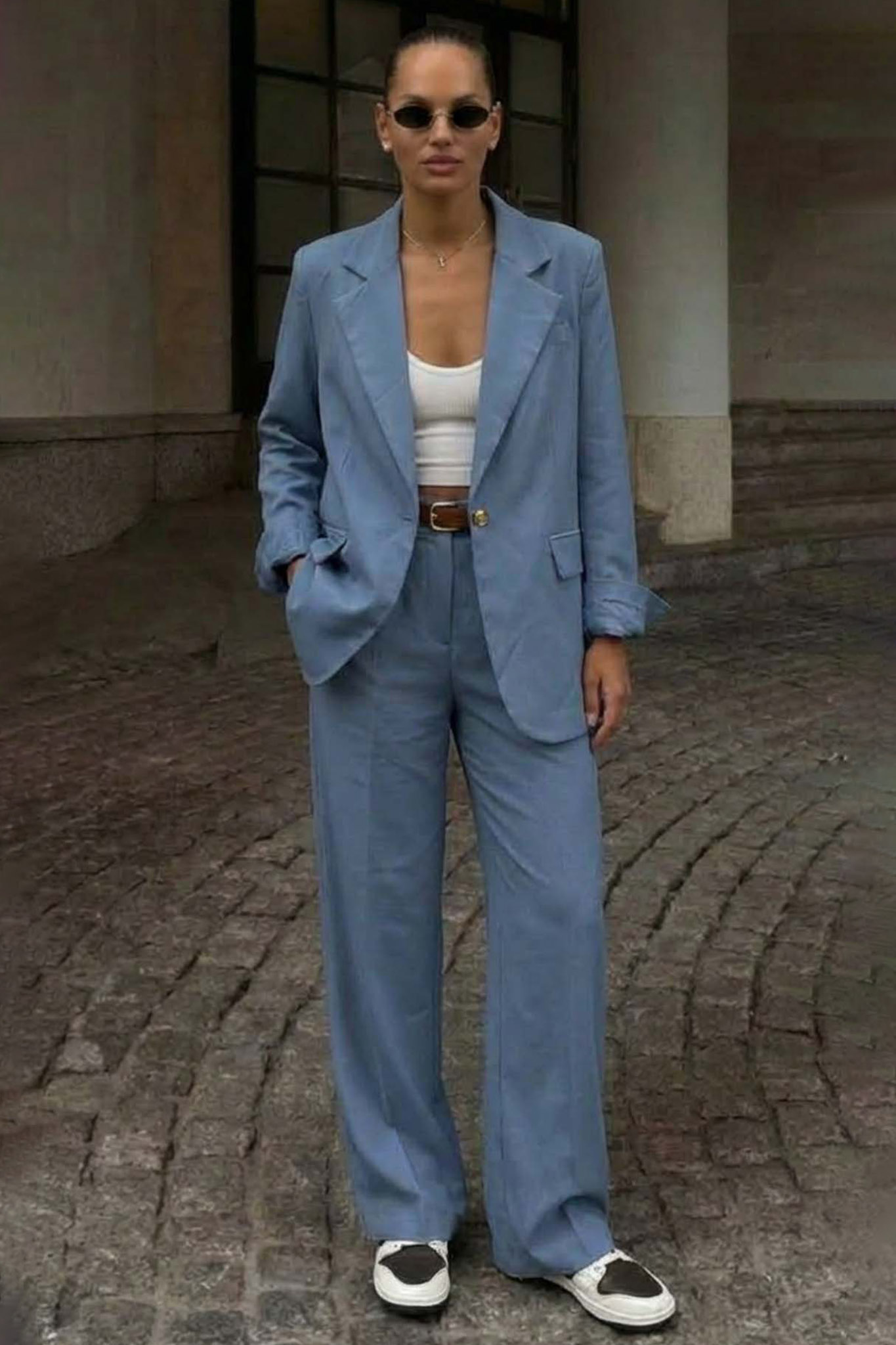 Σετ σακάκι παντελόνι. Το oversized σακάκι με το κλασικό πέτο συνδυάζεται άψογα με την ψηλόμεση παντελόνα σε φαρδιά γραμμή, δημιουργώντας μια στυλάτη σιλουέτα για όλες τις ώρες. Είναι η ιδανική επιλογή για ένα προσεγμένο office look ή μια chic απογευματινή εμφάνιση.