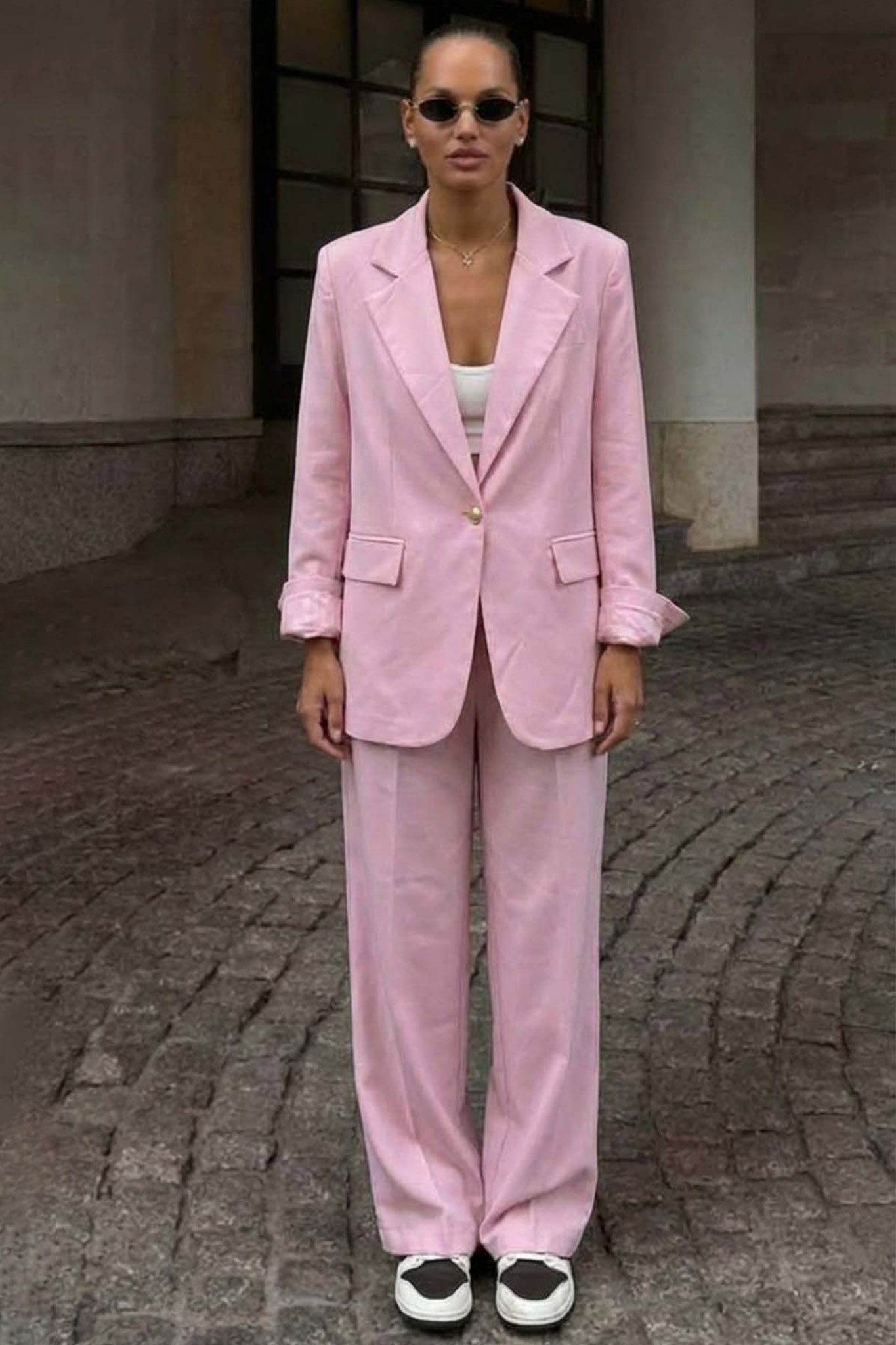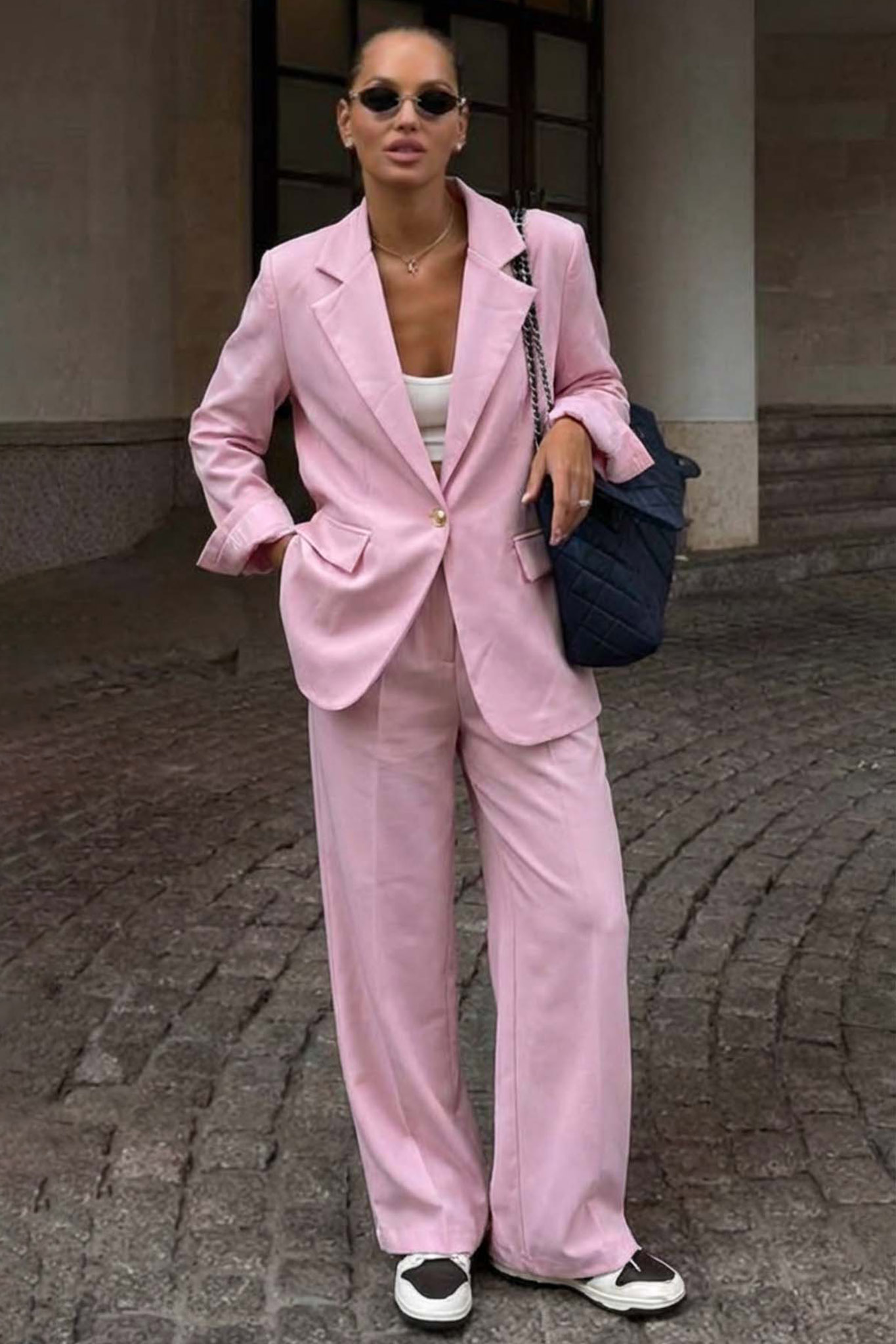 Σετ σακάκι παντελόνι. Το oversized σακάκι με το κλασικό πέτο συνδυάζεται άψογα με την ψηλόμεση παντελόνα σε φαρδιά γραμμή, δημιουργώντας μια στυλάτη σιλουέτα για όλες τις ώρες. Είναι η ιδανική επιλογή για ένα προσεγμένο office look ή μια chic απογευματινή εμφάνιση.
