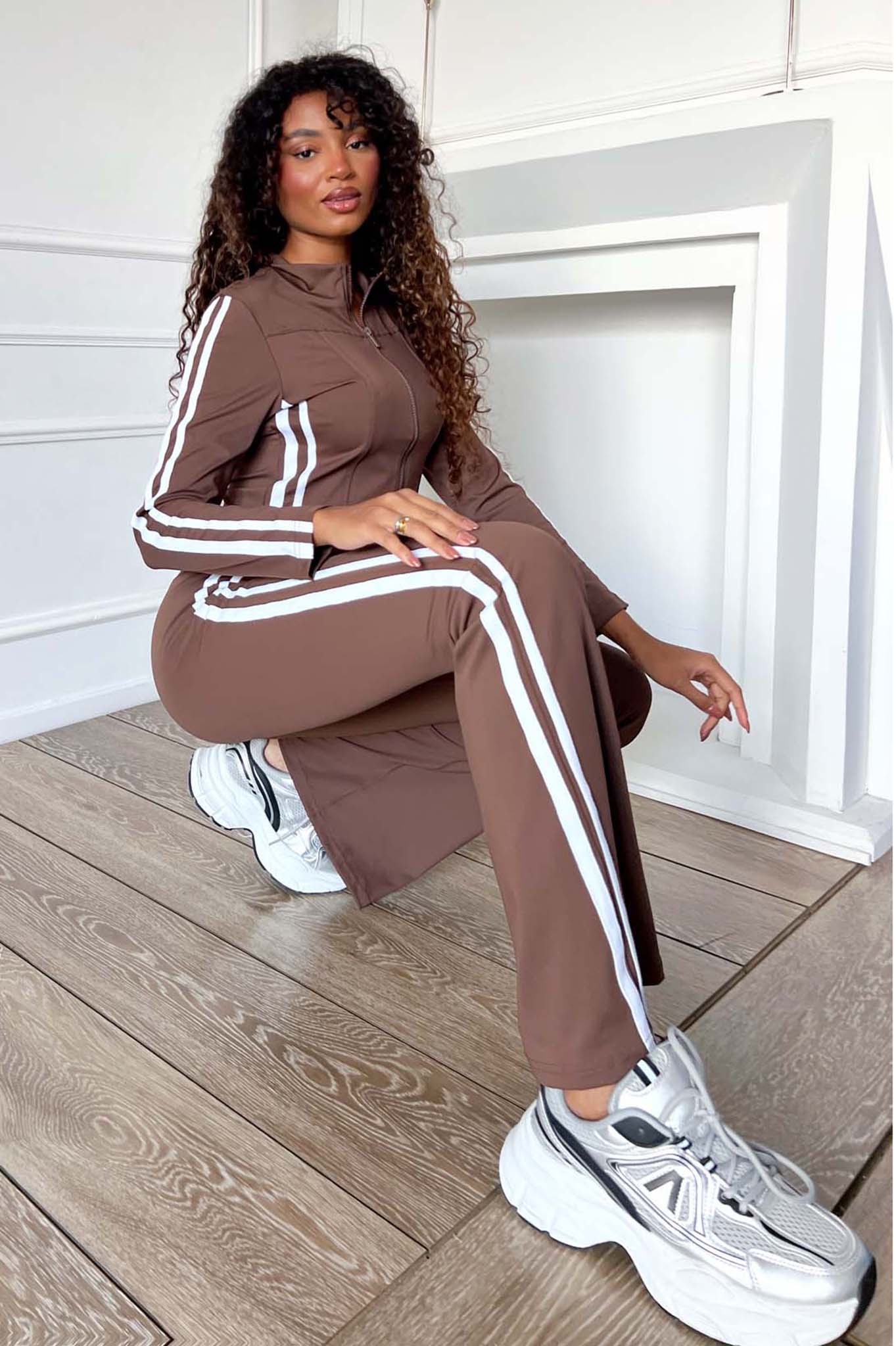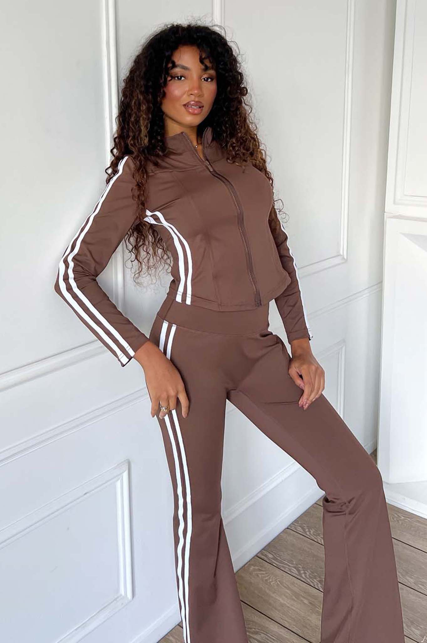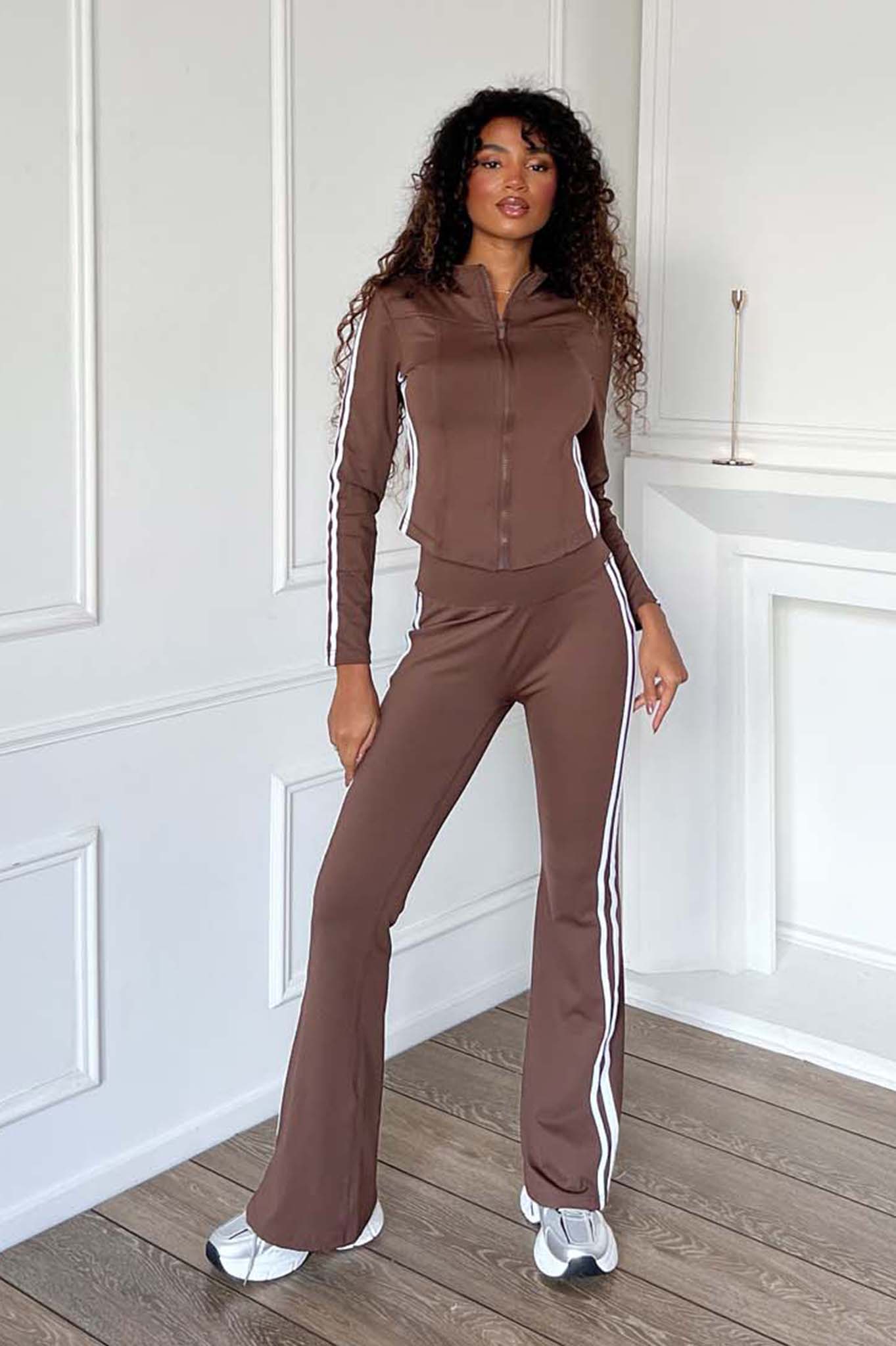 Σετ φόρμας σε εφαρμοστή γραμμή με κάθετες ρίγες στα μανίκια και στα πόδια. Διαθέτει ζακέτα με φερμουάρ και παντελόνι σε καμπάνα γραμμή για sporty chic εμφανίσεις