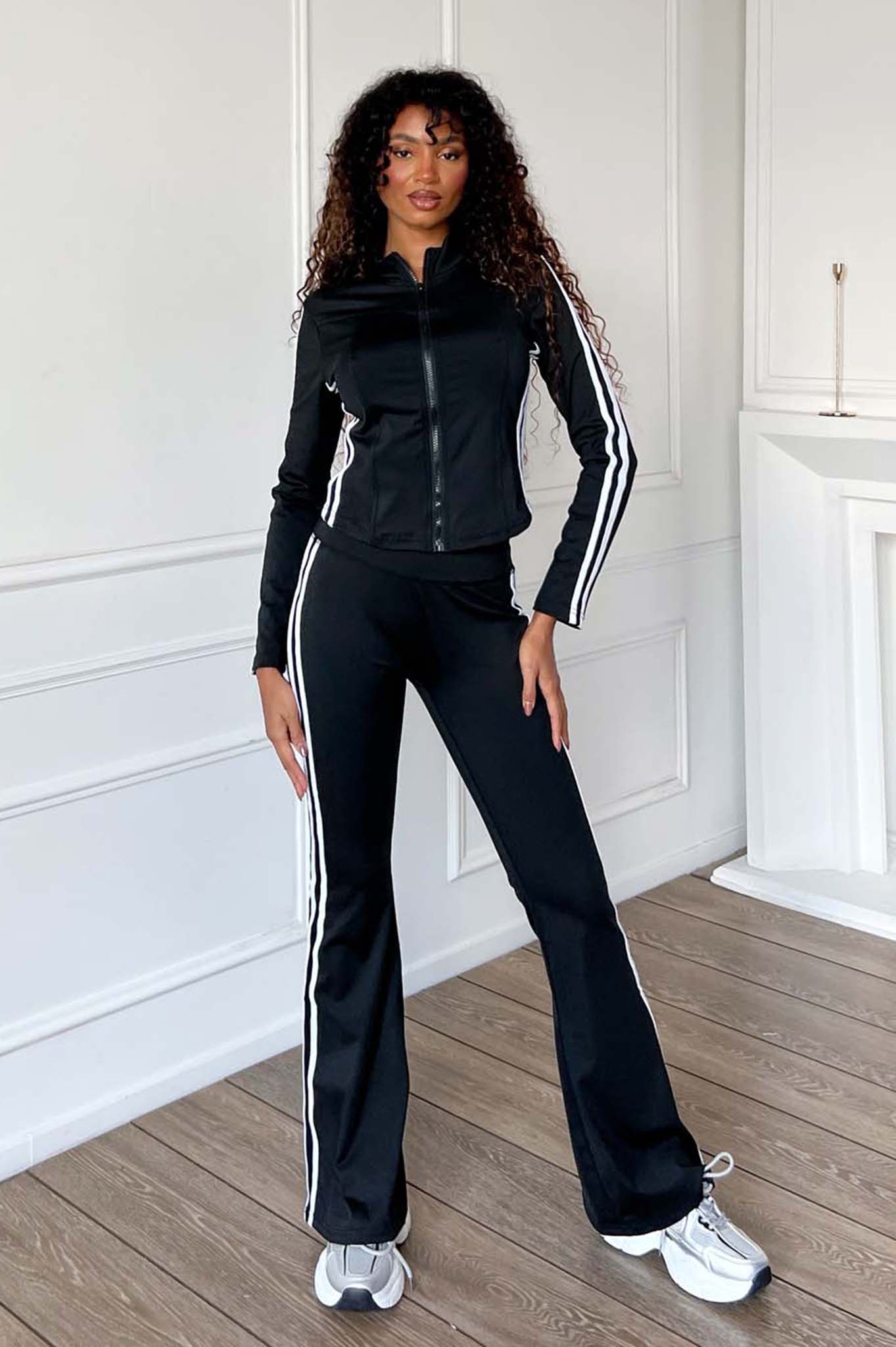 Σετ φόρμας σε εφαρμοστή γραμμή με κάθετες ρίγες στα μανίκια και στα πόδια. Διαθέτει ζακέτα με φερμουάρ και παντελόνι σε καμπάνα γραμμή για sporty chic εμφανίσεις