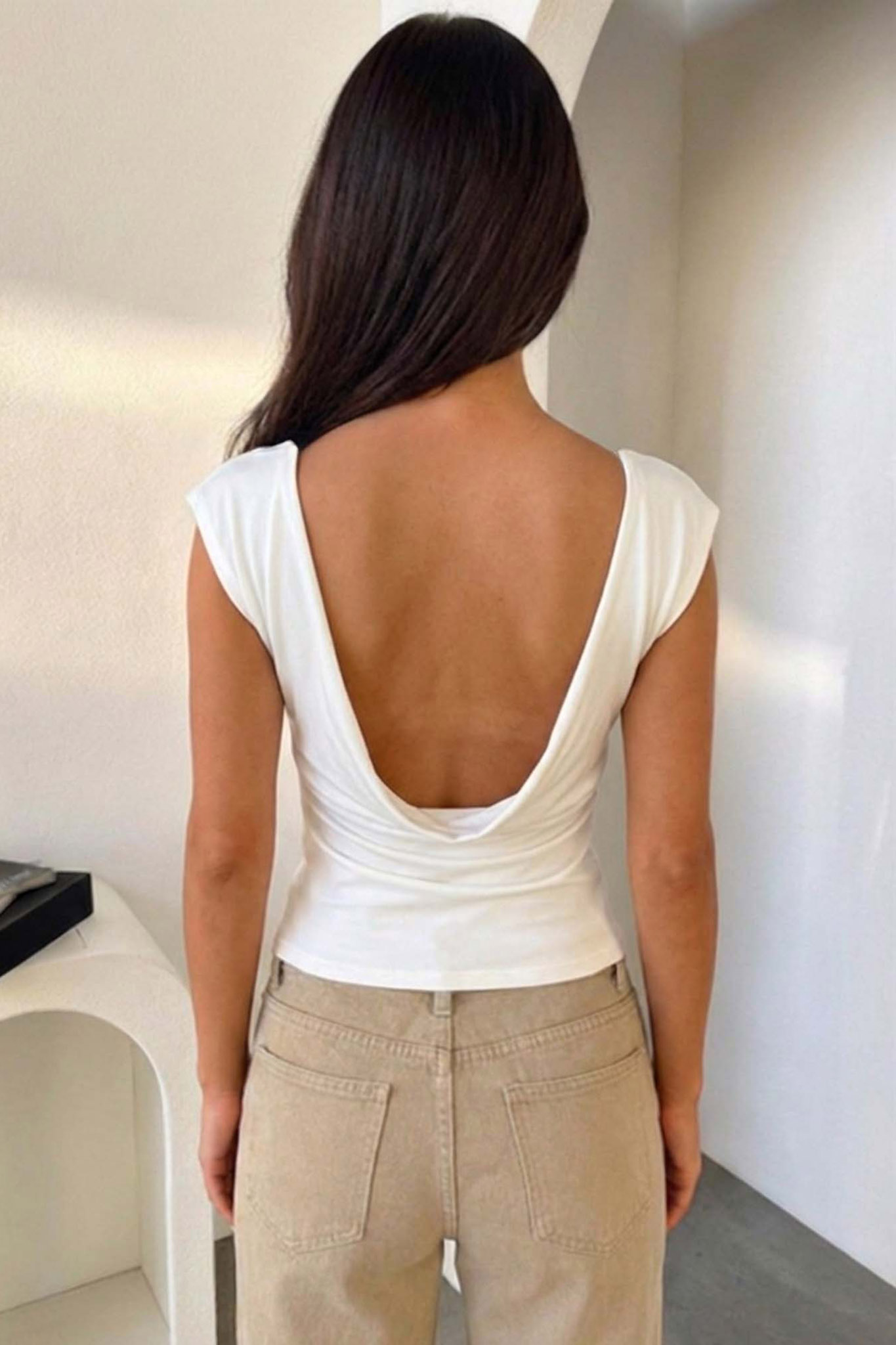Αμάνικο τοπ με ανοιχτή πλάτη, χαμηλή λαιμόκοψη και εφαρμοστή γραμμή, σε εσωτερικό χώρο καταστήματος.