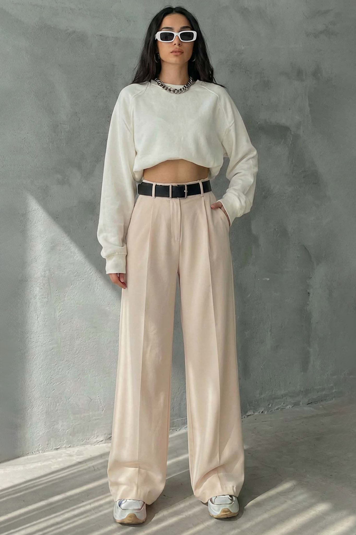 Αυτή η ψηλόμεση υφασμάτινη παντελόνααποτελεί τον ιδανικό συνδυασμό άνεσης και στυλ. Διαθέτει φαρδιά γραμμή που προσφέρει ελευθερία κινήσεων, ενώ οι κομψές πιέτες στο μπροστινό μέρος και οι θηλιές για ζώνη προσθέτουν μια προσεγμένη λεπτομέρεια στη σιλουέτα. Είναι η τέλεια επιλογή για να δημιουργήσετε μοντέρνα looks από το πρωί στο γραφείο μέχρι τις απογευματινές σας βόλτες.
