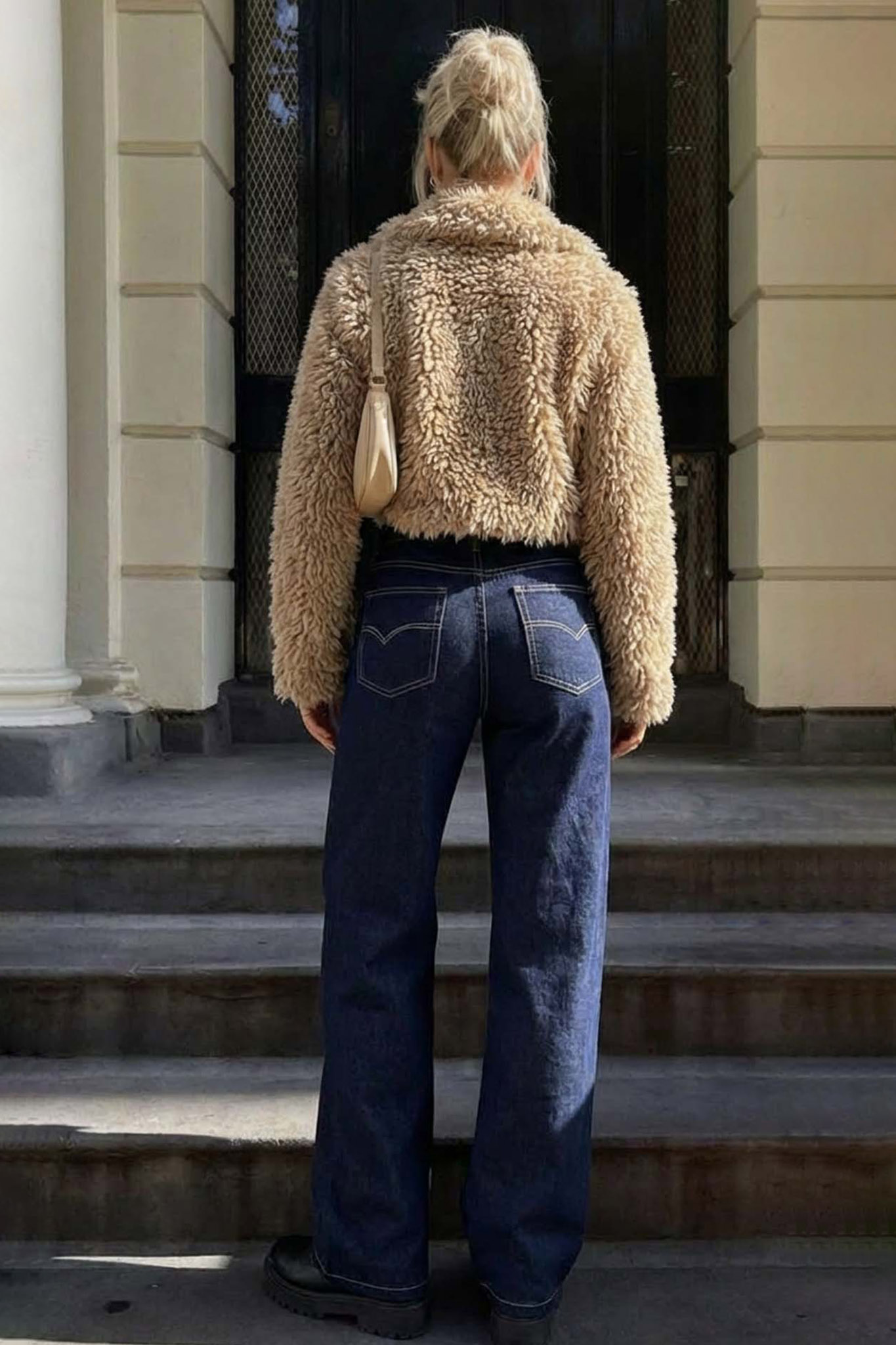 Ψηλόμεσο τζιν παντελόνι. Διαθέτει κολακευτική wide leg γραμμή και χαρακτηριστικά λευκά εξώγαζα που δημιουργούν μια ενδιαφέρουσα αντίθεση και δίνουν έναν vintage αέρα στο σύνολο. Είναι κατασκευασμένο από σταθερό denim ύφασμα υψηλής ποιότητας, προσφέροντας ανθεκτικότητα και τέλεια εφαρμογή που επιμηκύνει τη σιλουέτα.