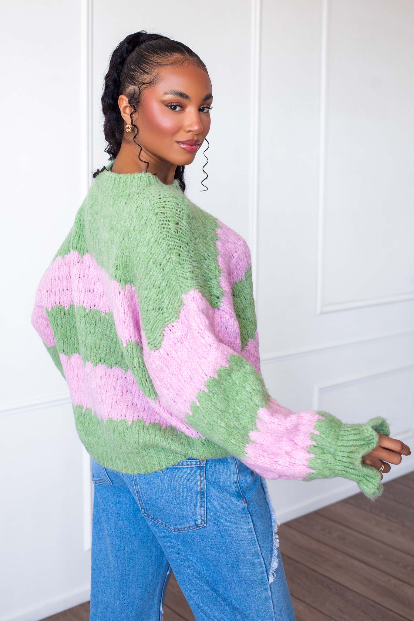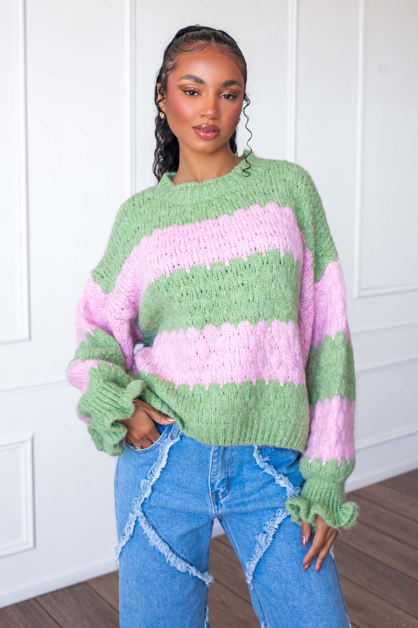 Πλεκτή ριγέ μπλούζα με ιδιαίτερη λεπτομέρεια στα μανίκια. Μήκος 55-62cm, στήθος 67cm, μανίκι 48cm