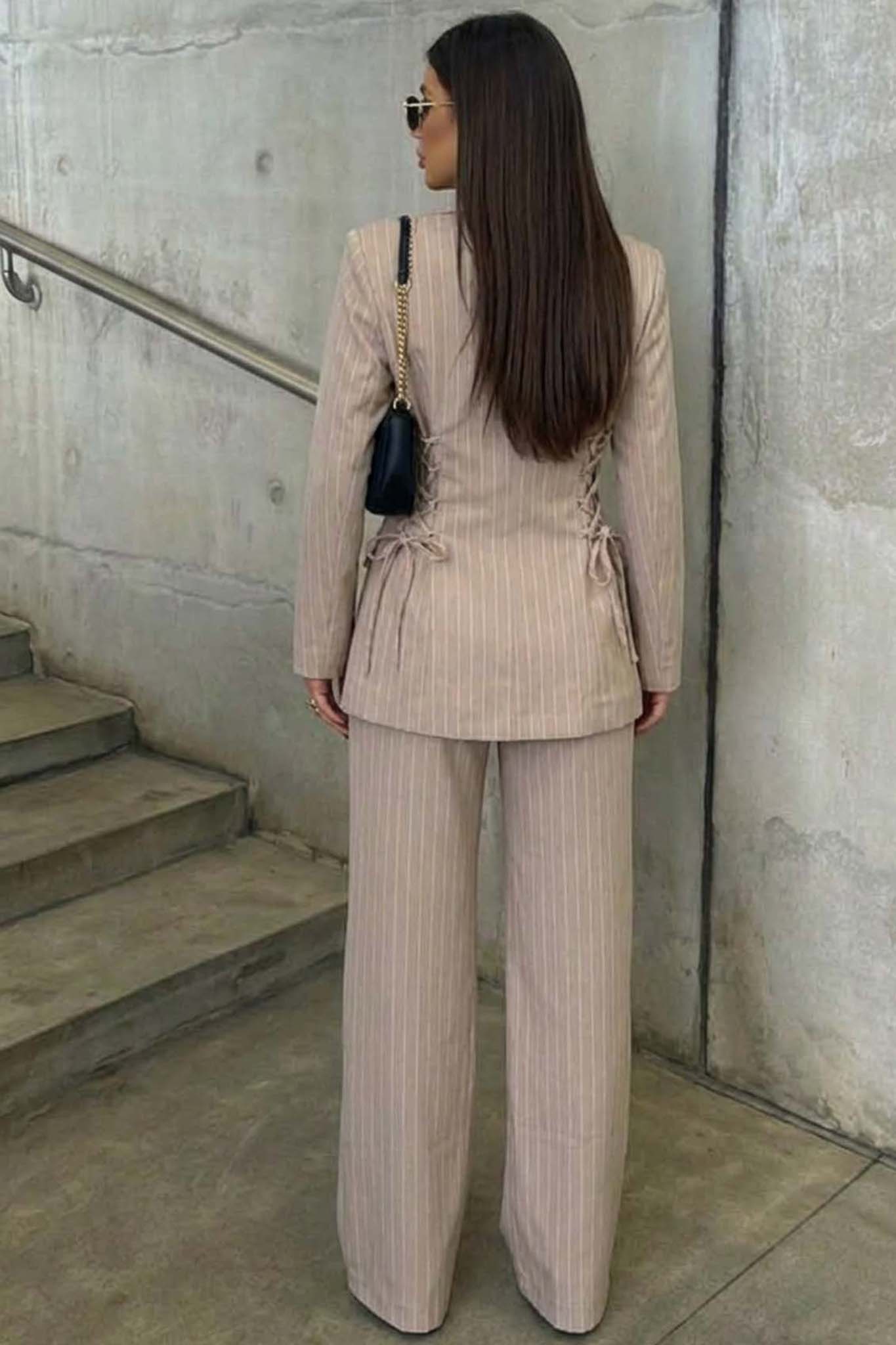 Αναβαθμίστε το στυλ σας με αυτό το εντυπωσιακό σετ με λεπτές ρίγες (pinstripe). Διαθέτει κλασικό πέτο και κλείσιμο με δύο κουμπιά μπροστά. Το ιδιαίτερο χαρακτηριστικό του είναι τα ρυθμιζόμενα κορδόνια σε στυλ κορσέ στα πλαϊνά, τα οποία προσθέτουν μια μοντέρνα και θηλυκή πινελιά στη σιλουέτα.