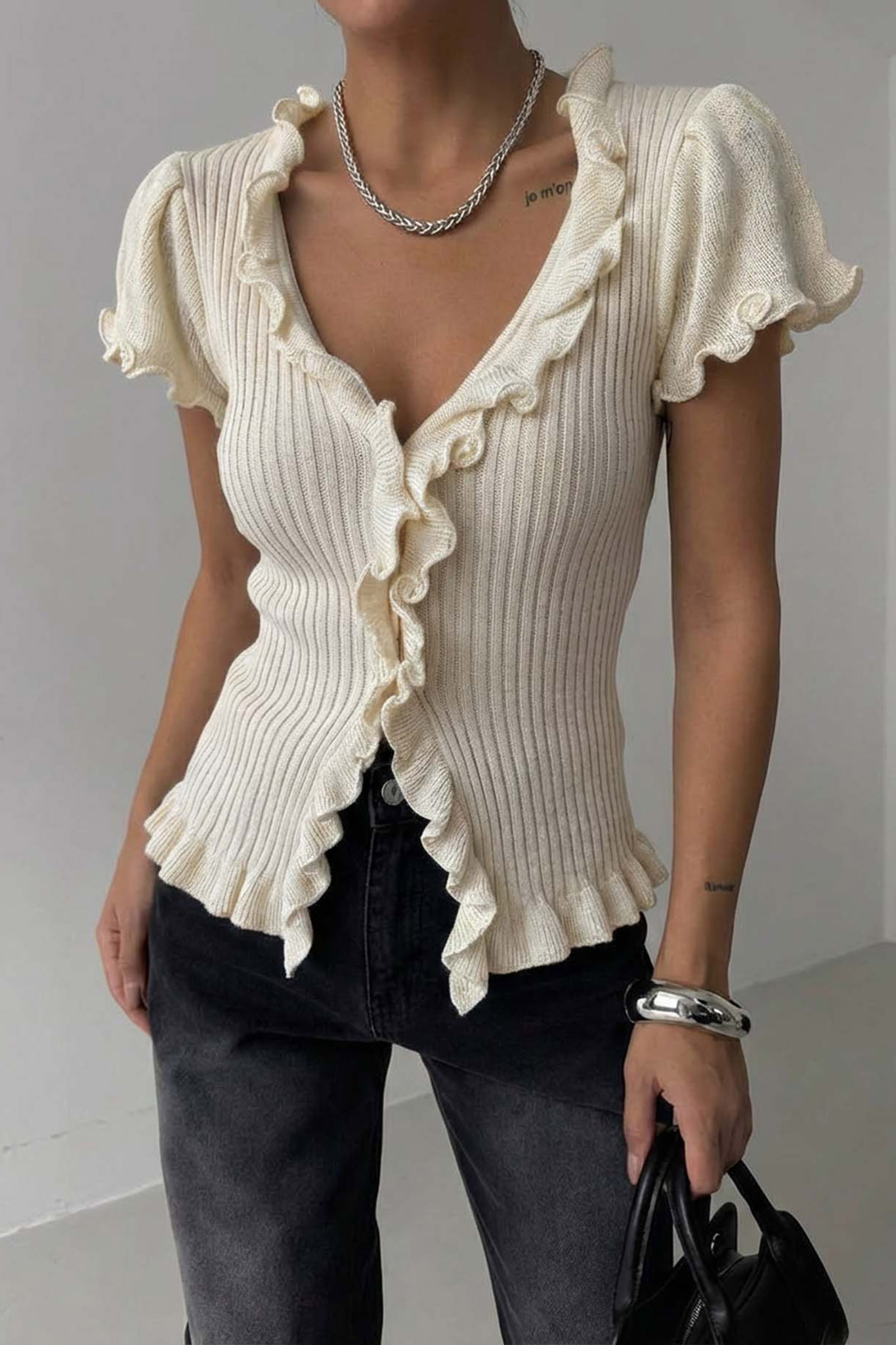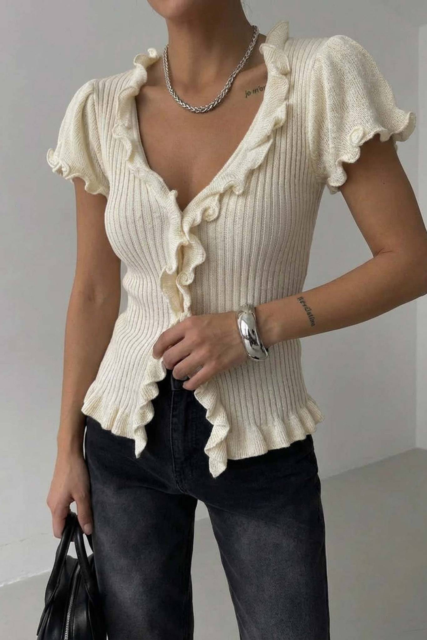 Κοντομάνικη ζακέτα με βολάν στις άκρες. Ιδανικό για να φορεθεί από το πρωί έως το βράδυ.