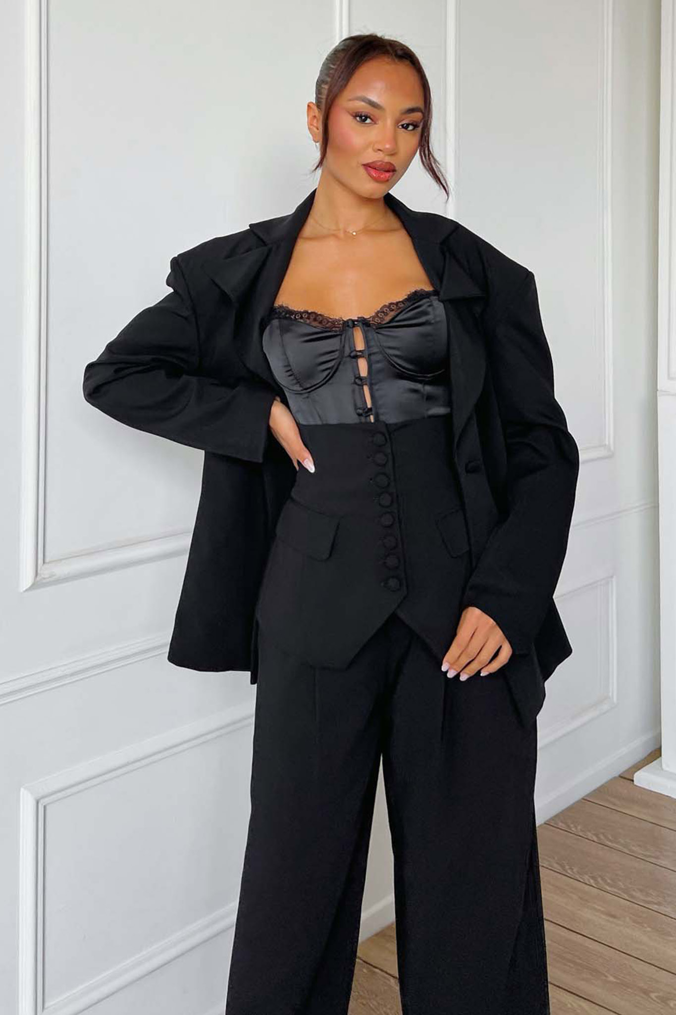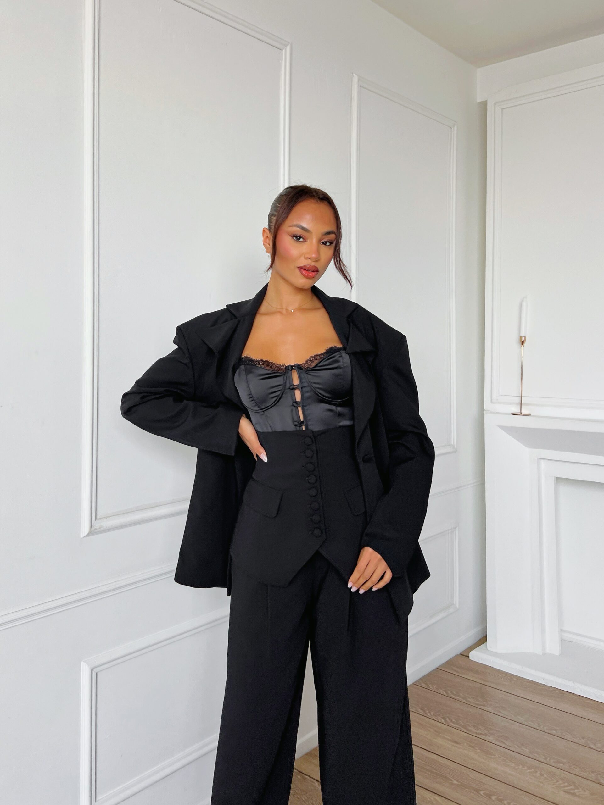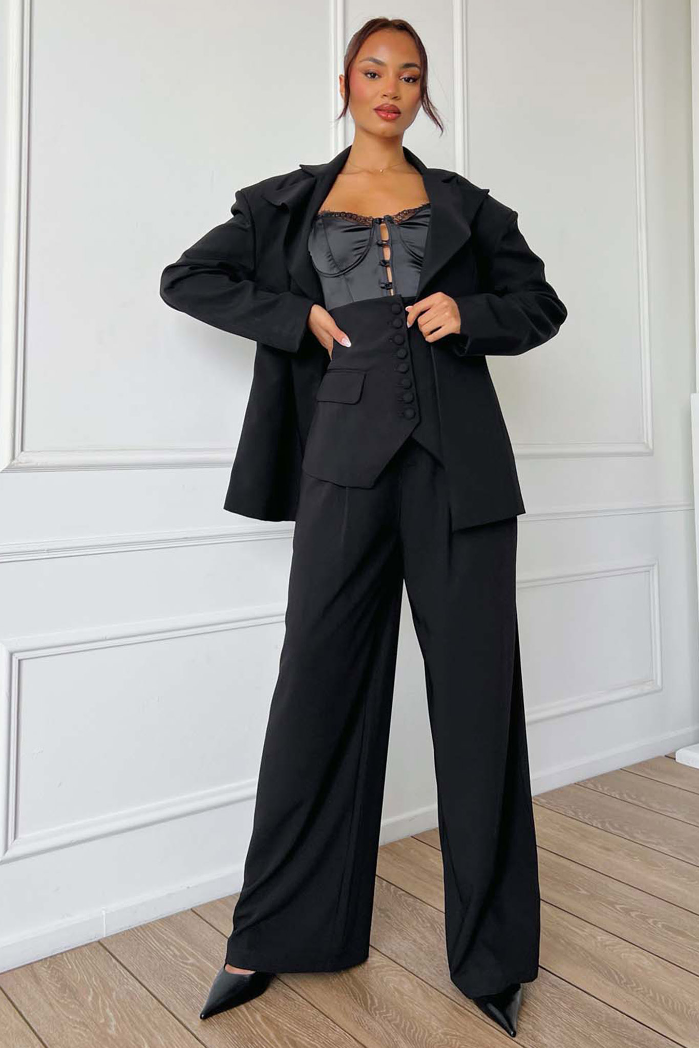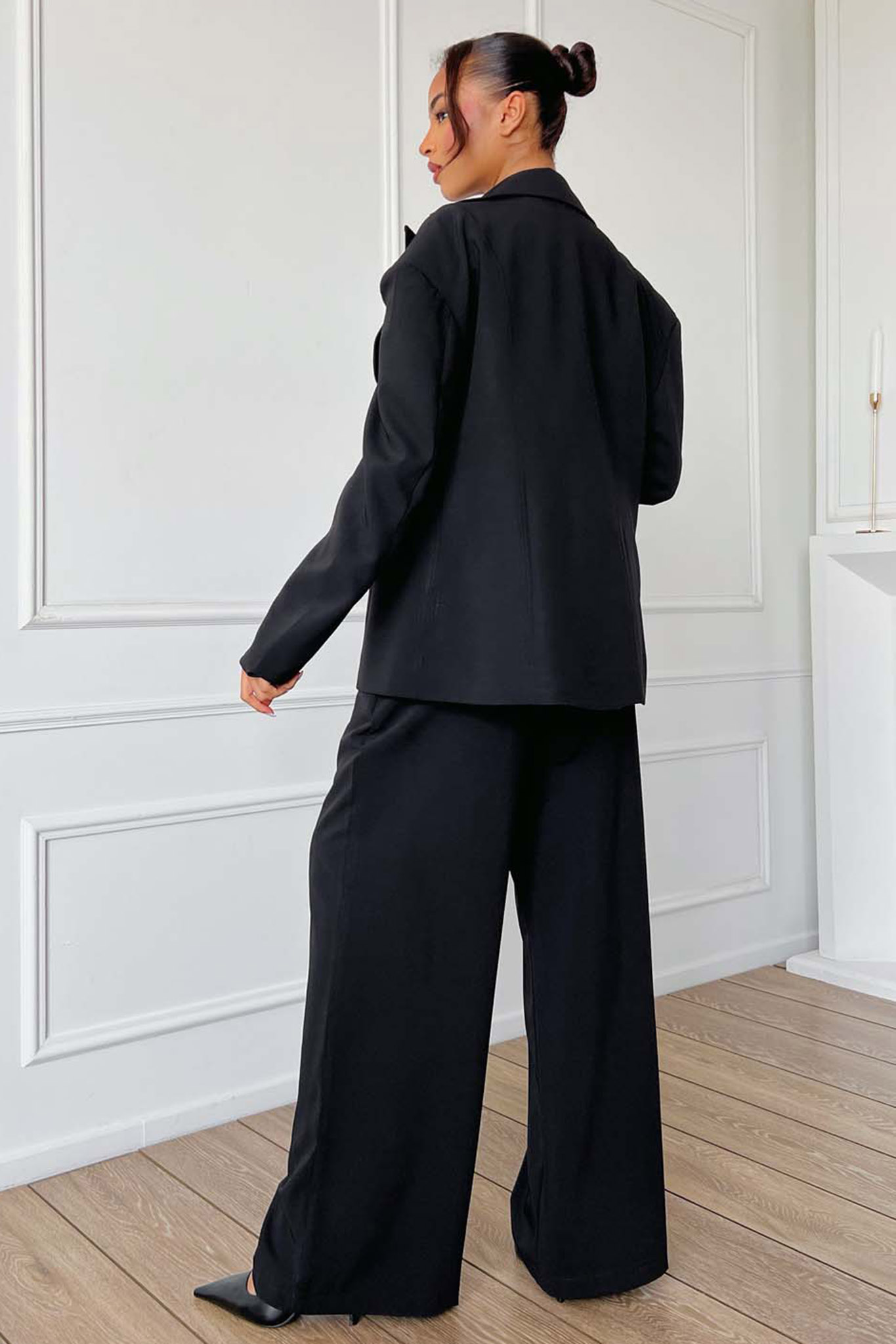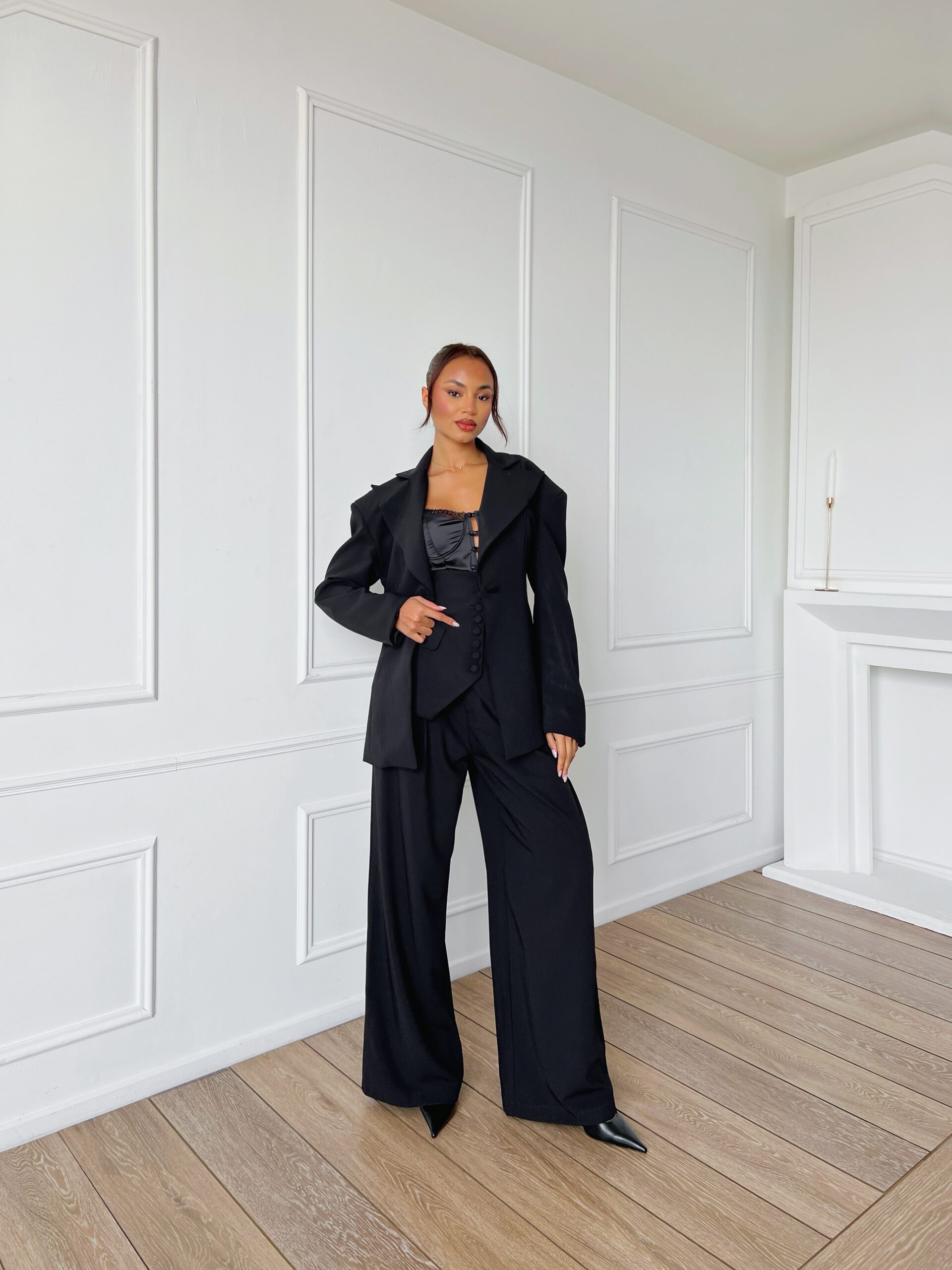 Μοντέρνο γυναικείο σετ (suit set), που συνδυάζει την κλασική κομψότητα με τις σύγχρονες τάσεις της μόδας.