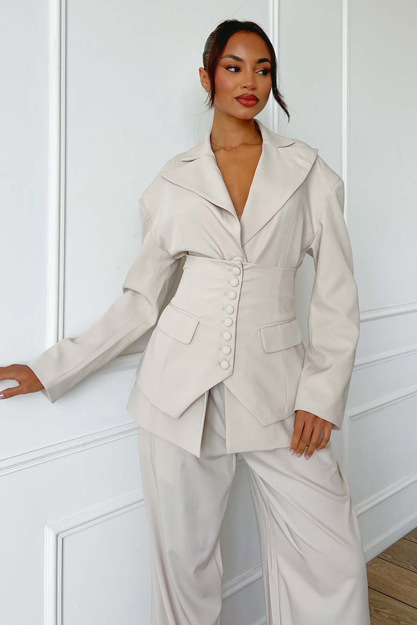 Μοντέρνο γυναικείο σετ (suit set), που συνδυάζει την κλασική κομψότητα με τις σύγχρονες τάσεις της μόδας.
