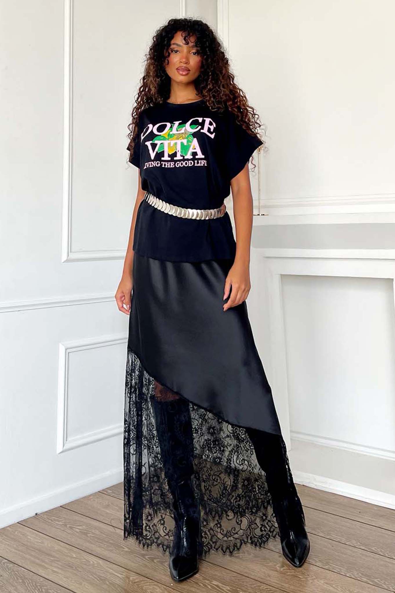Μίντι φούστα σατέν με δαντέλα στο τελείωμα.