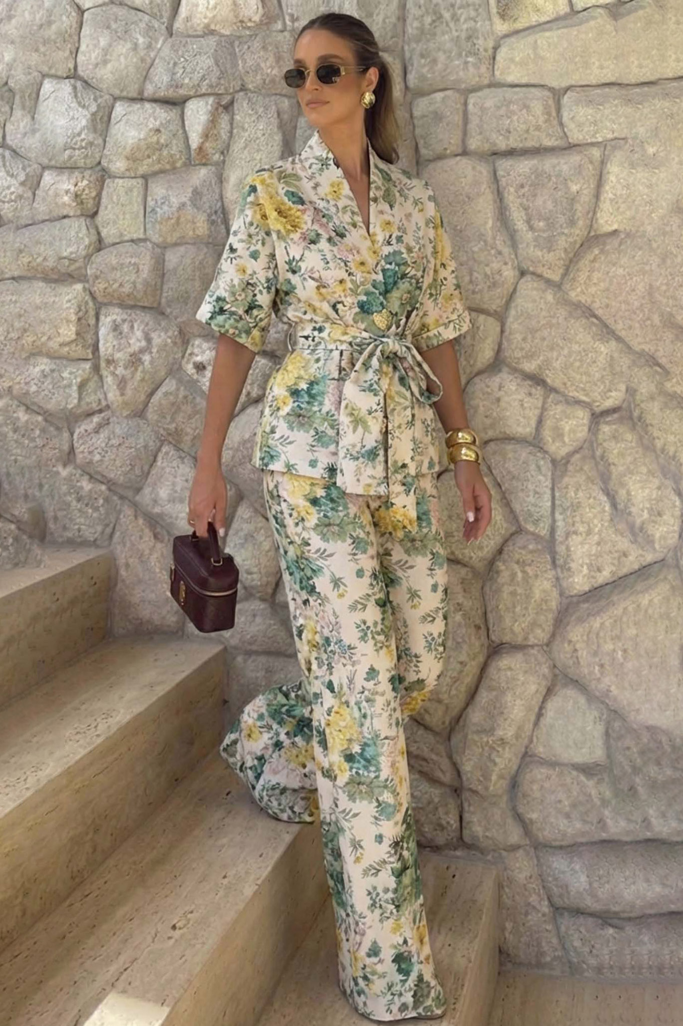Meldaσετ σακάκι κοντομάνικο με παντελόνι φλοράλ κίτρινο