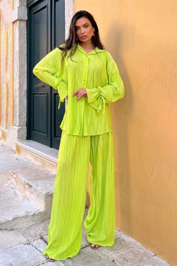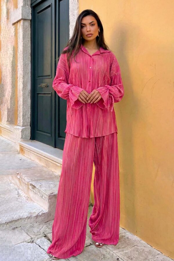 Σετ ριπ πλεκτό, με ελαφριά πλέξη εφαρμοστό κάτω μέρος και άνετο επάνω μέρος. Προσφέρει άνετο και glam αποτέλεσμα. Ιδανικό για καθημερινές εμφανίσεις. Μπλούζα: (μήκος 56cm,στήθος 54cm, μανίκι 60cm) παντελόνι: (μήκος 104cm,μέση 32cm).