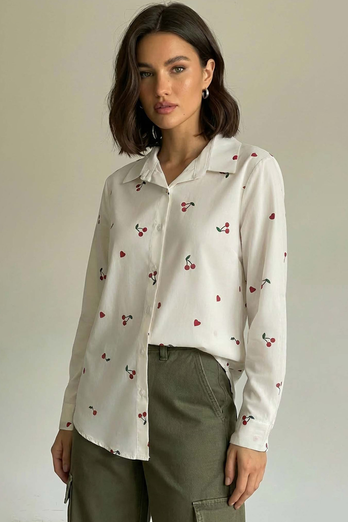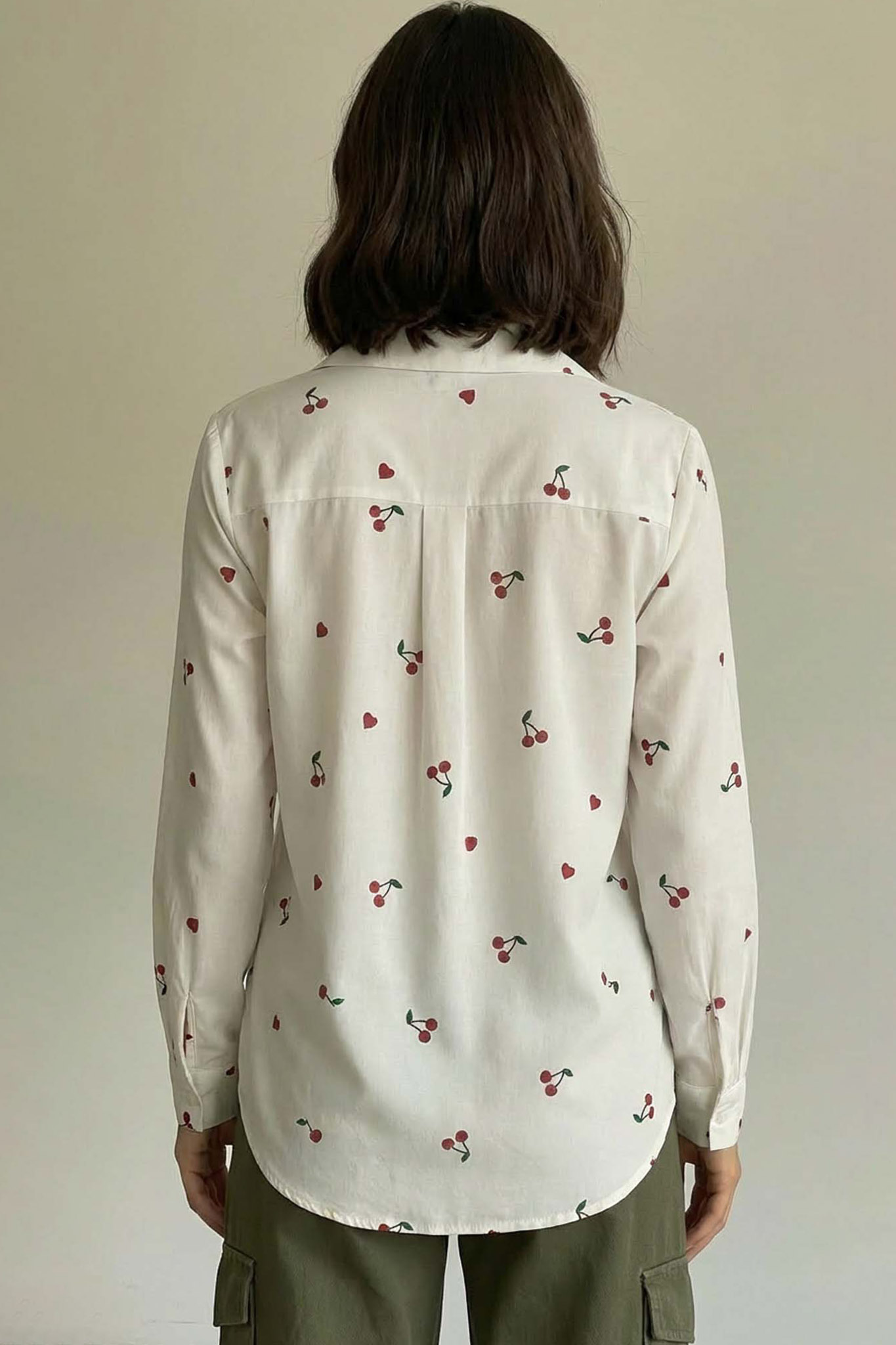 Πουκάμισο με παιχνιδιάρικο και μοντέρνο ύφος με κεράσια τα οποία είναι διασκορπισμένα σε όλη την επιφάνεια του υφάσματος. Διαθέτει κλασικό γιακά, μακριά μανίκια με φαρδιές μανσέτες και κλείσιμο με κουμπιά μπροστά. Μανίκι 61cm, στηθος 100cm, μήκος 56m