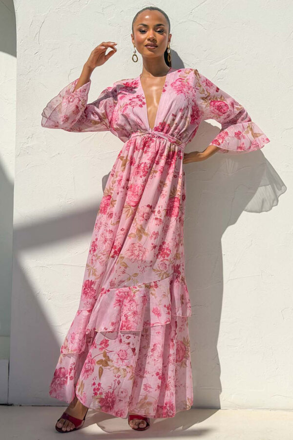 Meredithμάξι φλοράλ φόρεμα με έναν ώμο ροζ