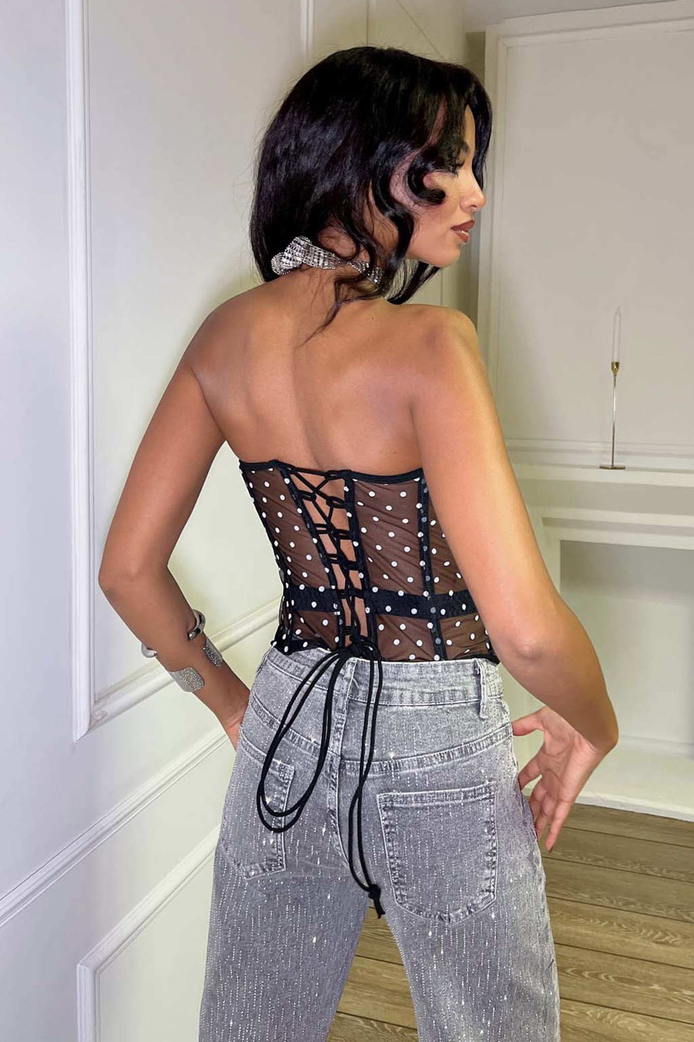 Στράπλες κορσές με το διαχρονικό μοτίβο πουά είναι η ιδανική επιλογή για μια λαμπερή βραδινή έξοδο. Διαθέτει διαφάνεια στο σώμα που αναδεικνύει τη σιλουέτα, ενισχυμένα cups για σταθερό κράτημα και κομψές μπανέλες που χαρίζουν δομή και στυλ. Συνδυάζεται υπέροχα με ψηλόμεσα παντελόνια ή φούστες, προσφέροντας ένα θηλυκό και απόλυτα μοντέρνο look. Μήκος 28cm, στήθος 68cm.