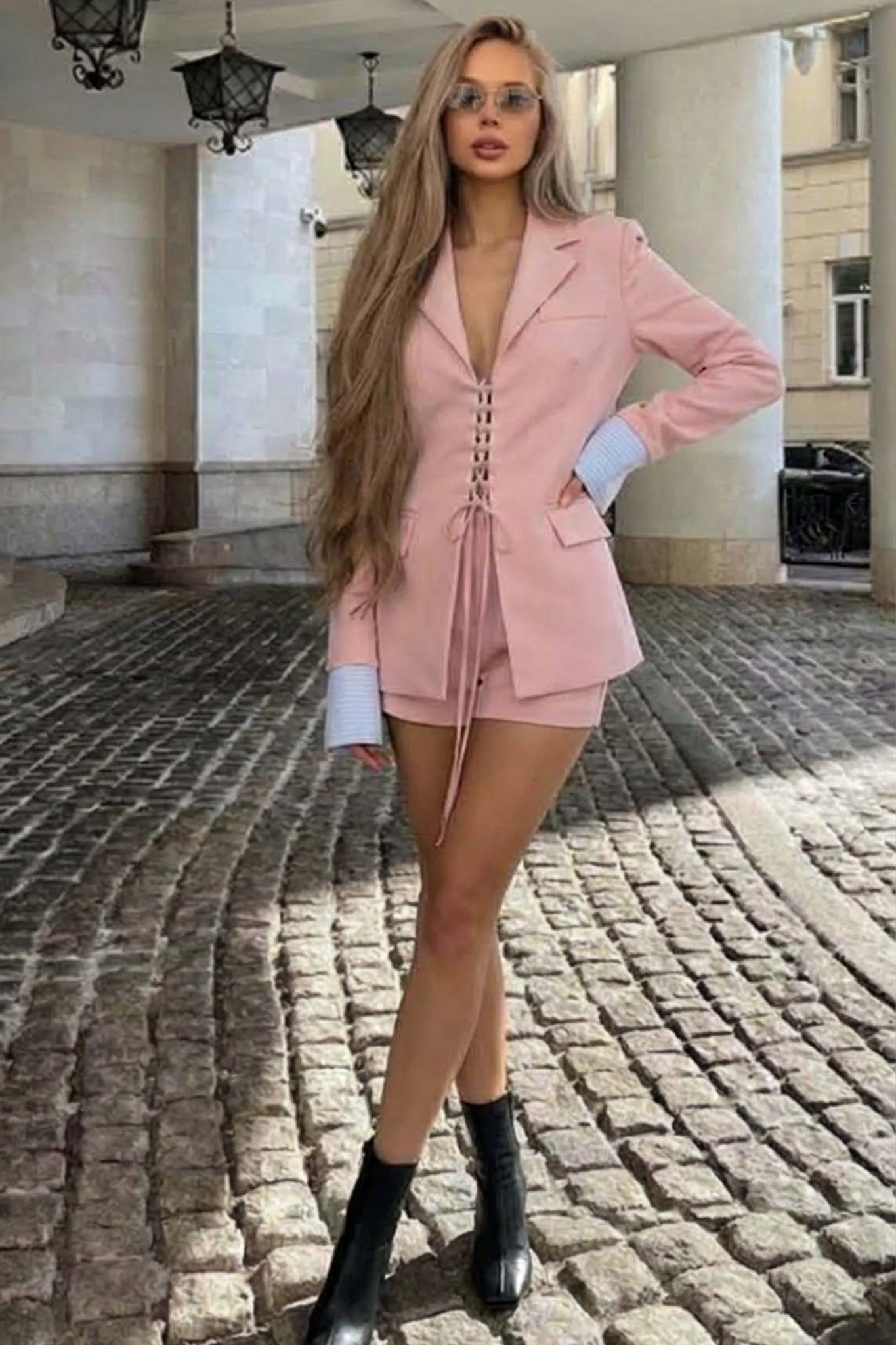Σακάκι σε μοντέρνα, εφαρμοστή γραμμή. Διαθέτει βαθύ ντεκολτέ σε σχήμα V και κλείσιμο με δέσιμο κορδονιού στο μπροστινό μέρος, που προσθέτει ιδιαίτερο στυλ και θηλυκότητα.