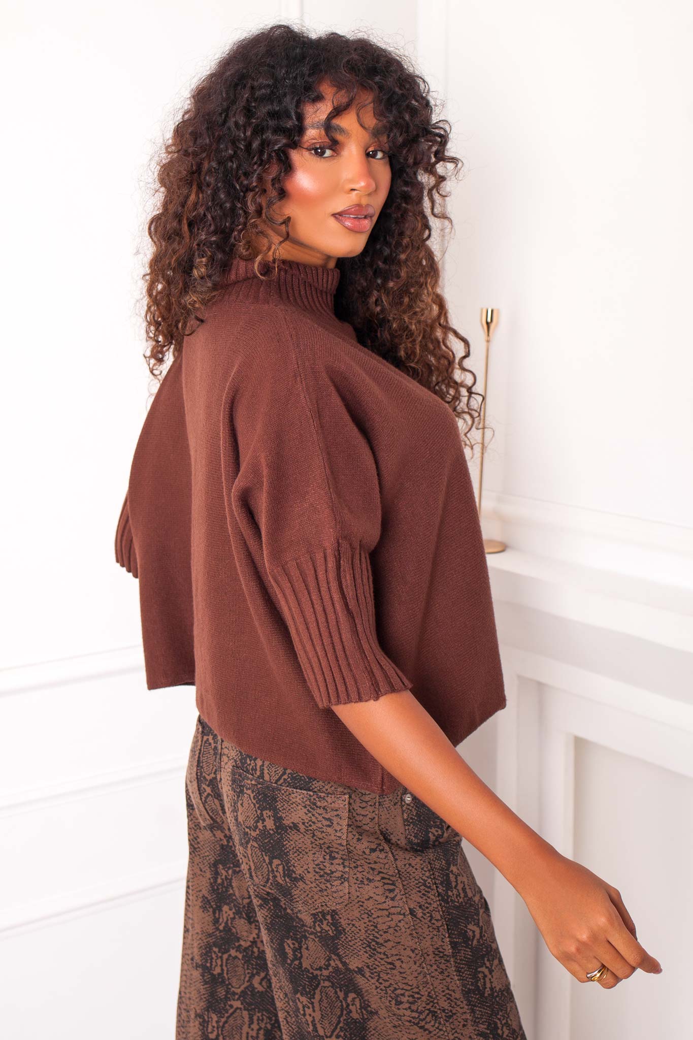Πουλόβερ με ψηλό λαιμό και φαρδιά μανίκια 3/4, σε χαλαρή γραμμή. Ιδανικό για cozy καθημερινά outfits, προσφέρει στυλ και άνεση για casual και chic εμφανίσεις. Συνδυάζεται εύκολα με τζιν ή υφασμάτινα παντελόνια για all day look.. Μήκος 50cm, στήθος 65cm, μανίκι 30cm