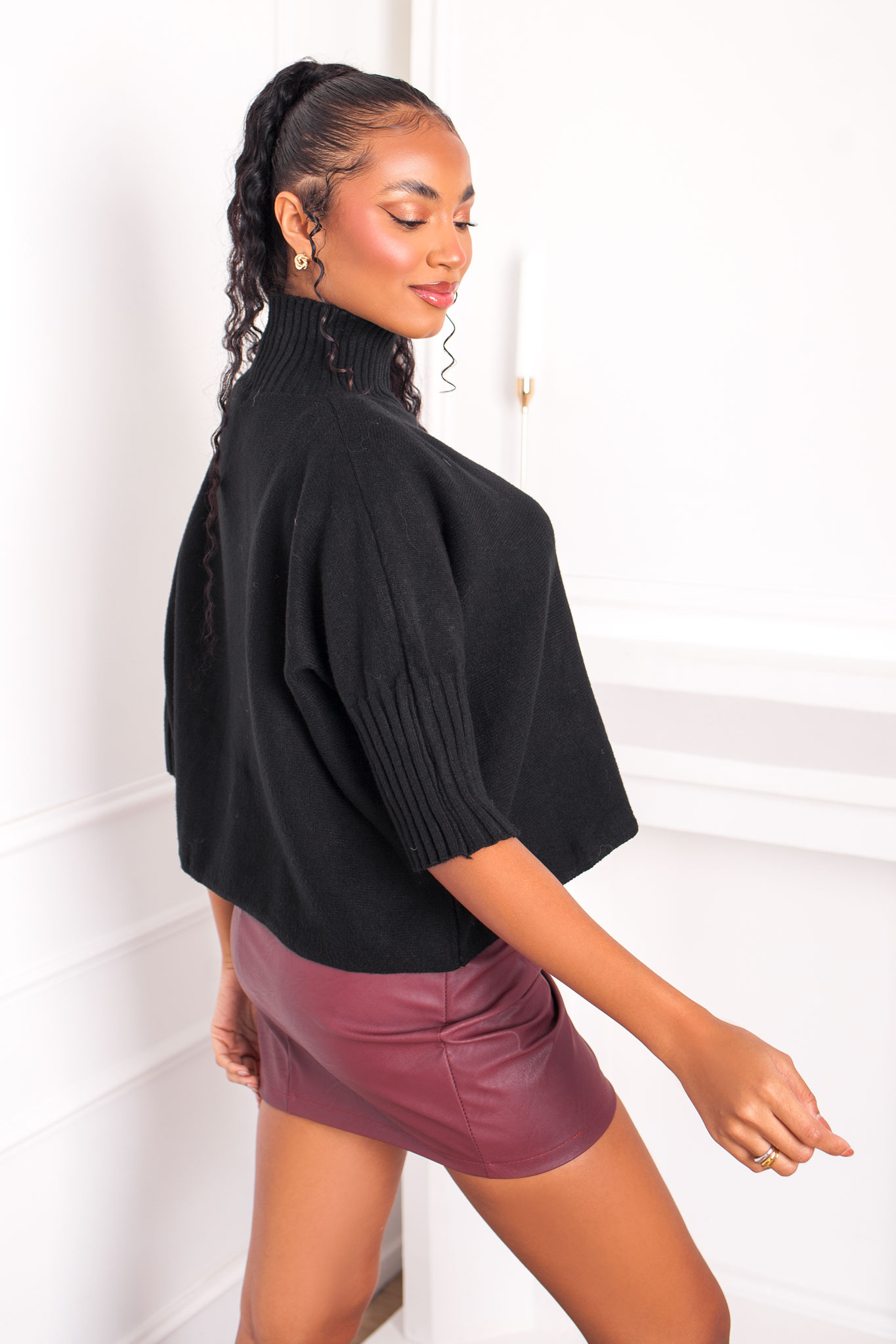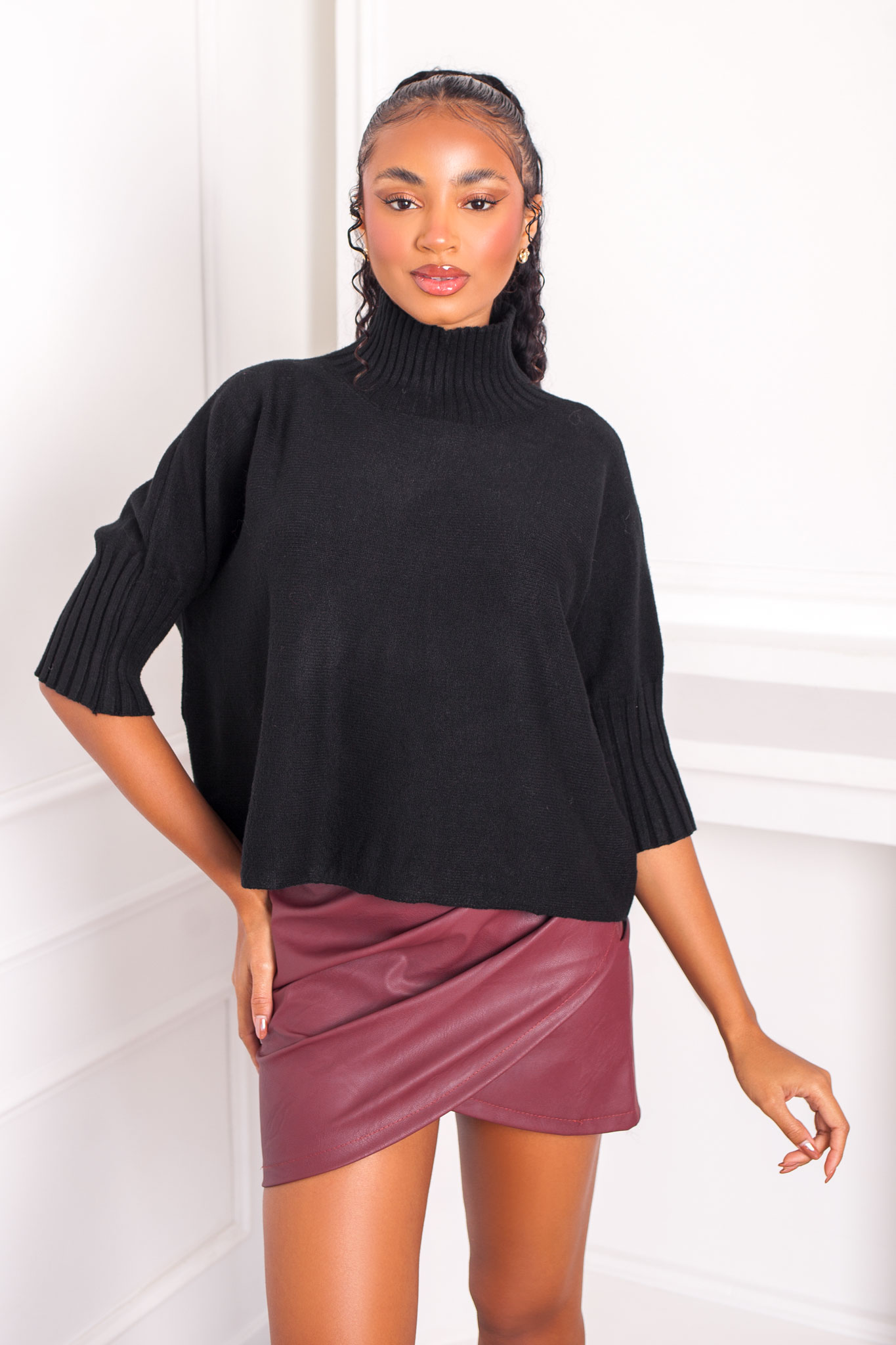 Πουλόβερ με ψηλό λαιμό και φαρδιά μανίκια 3/4, σε χαλαρή γραμμή. Ιδανικό για cozy καθημερινά outfits, προσφέρει στυλ και άνεση για casual και chic εμφανίσεις. Συνδυάζεται εύκολα με τζιν ή υφασμάτινα παντελόνια για all day look.. Μήκος 50cm, στήθος 65cm, μανίκι 30cm