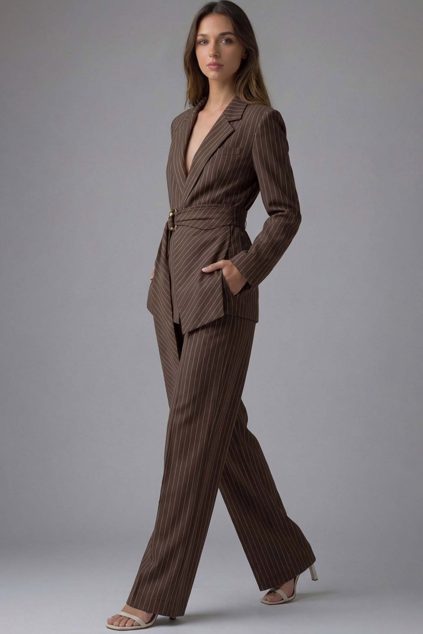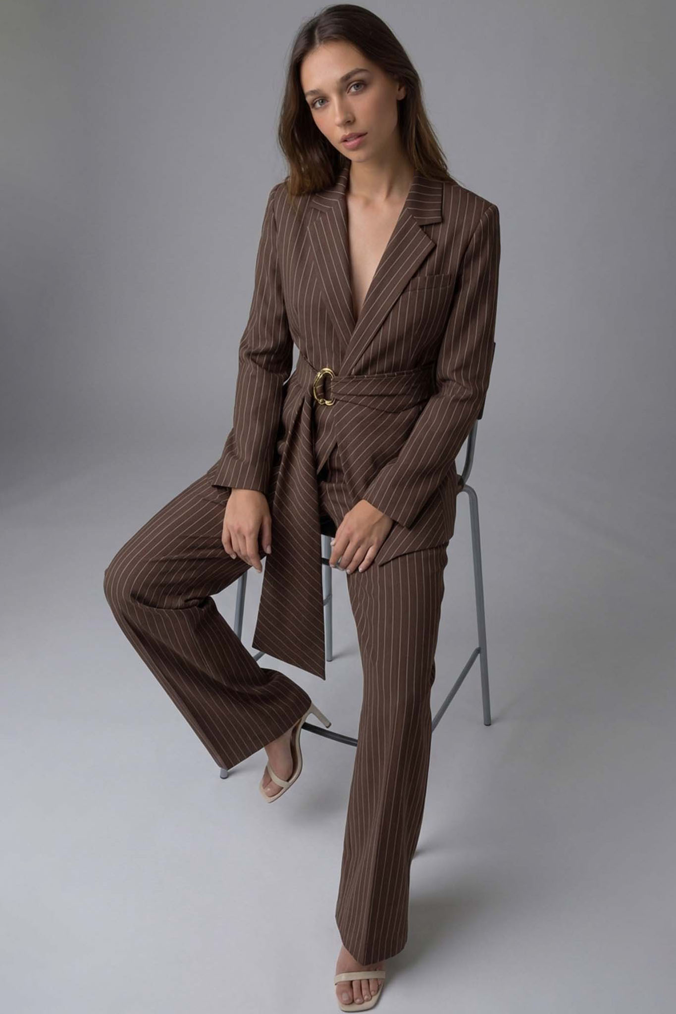 Σετ σακάκι παντελόνι ριγέ με διακοσμητική αγκράφα στο ζωνάκι ώστε να αναδεικνύει τη σιλουέτα. Είναι ιδανικό για πιο ιδιαίτερες περιστάσεις.
