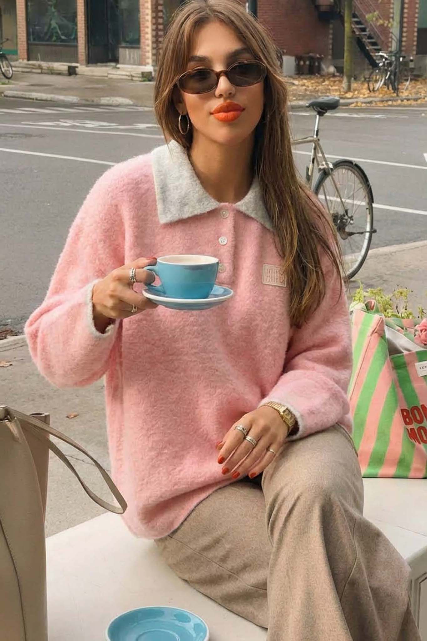 Χνουδωτό, κίτρινο πουλόβερ με μακριά μανίκια. Διαθέτει γιακά και κουμπιά στην πατιλέτα. Ιδανική επιλογή για καθημερινές εμφανίσεις.