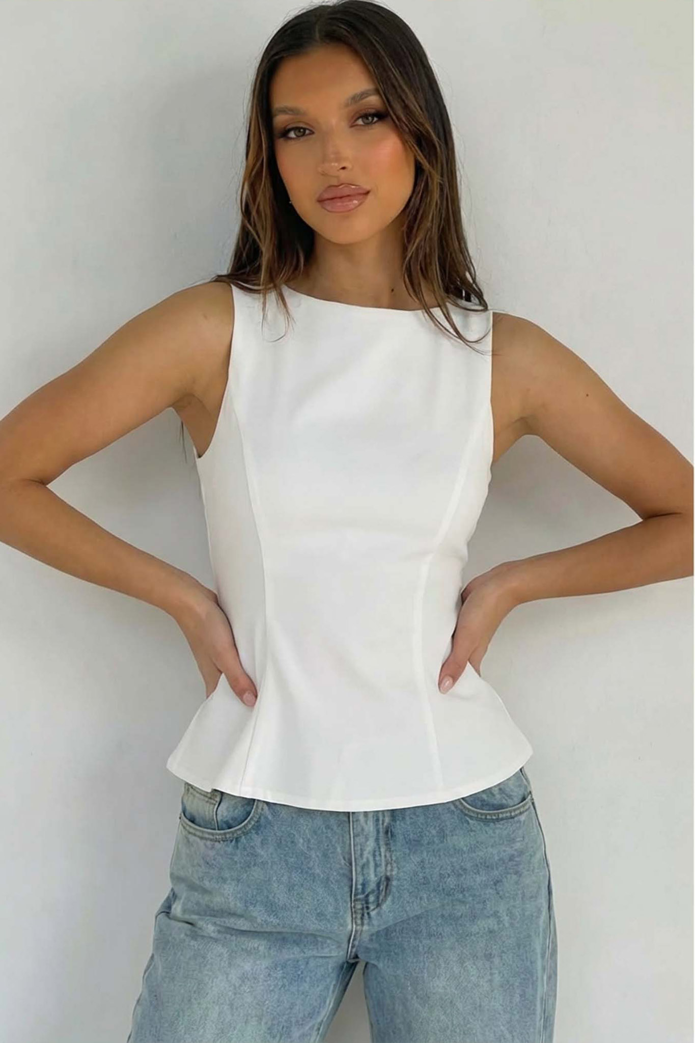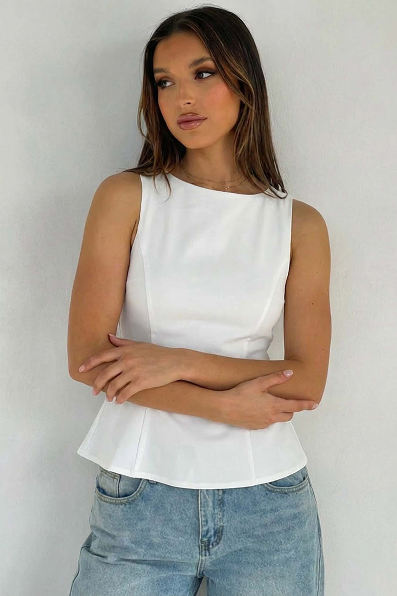 Αμάνικο τοπ είναι η ιδανική επιλογή για σικάτες εμφανίσεις. Διαθέτει κλειστή λαιμόκοψη και θηλυκή γραμμή peplum που ανοίγει απαλά στη μέση, κολακεύοντας τη σιλουέτα. Είναι φτιαγμένο από σταθερό ύφασμα που διατηρεί τη φόρμα του και συνδυάζεται τέλεια τόσο με το αγαπημένο σας τζιν για ένα προσεγμένο καθημερινό look, όσο και με υφασμάτινο παντελόνι για μια επίσημη έξοδο.