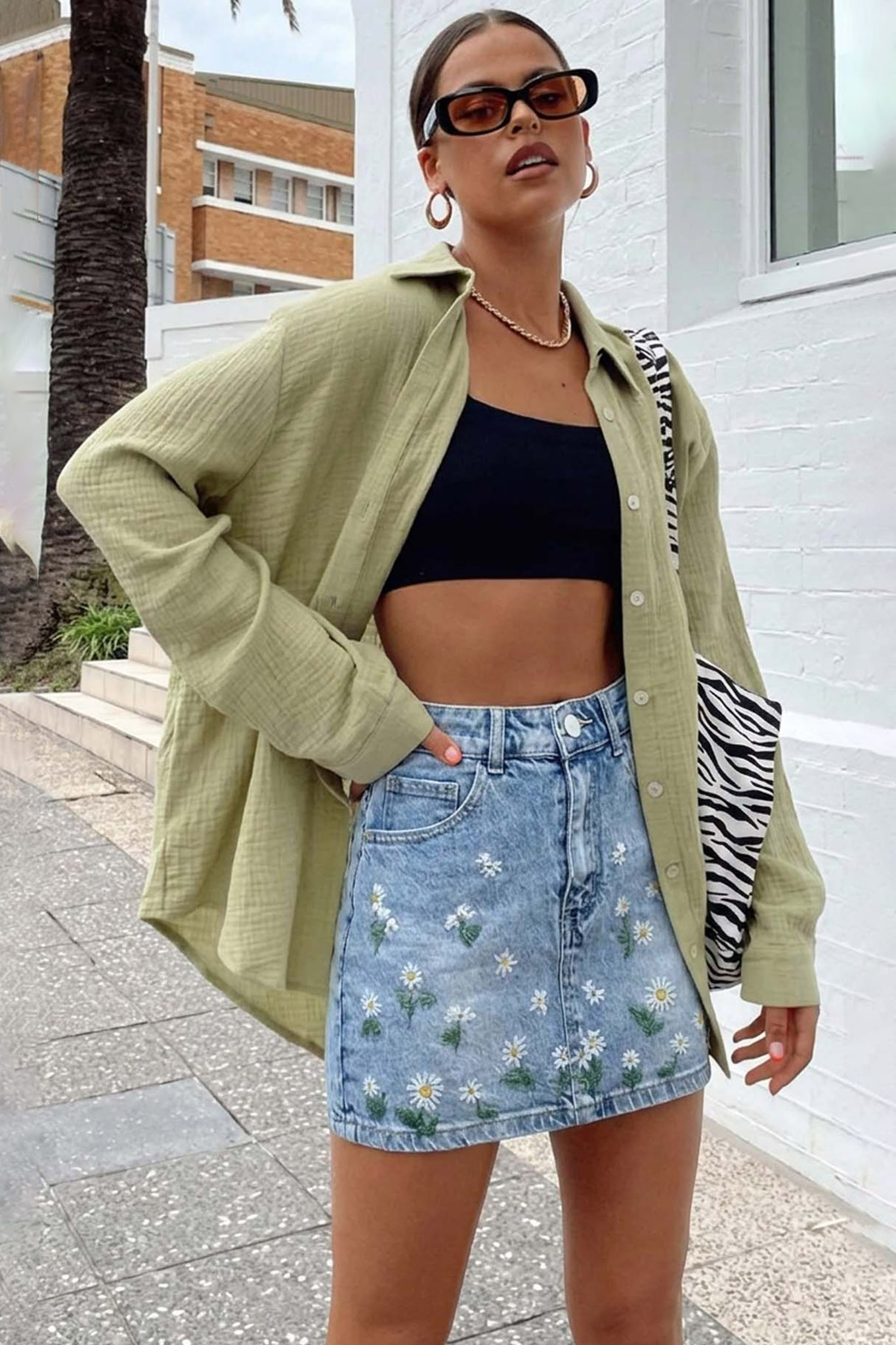 Φούστα denim μίνι σε εφαρμοστή γραμμή με κεντημένα λουλούδια για girly καλοκαιρινό ύφος. Ιδανική για καθημερινές εμφανίσεις και casual looks με χαρακτήρα.