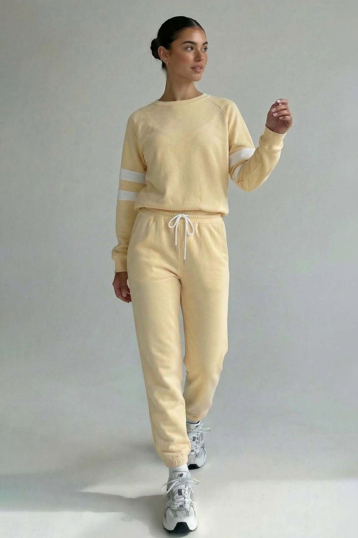 Σετ φόρμας το οποίο αποτελείται από μπλούζα με στρογγυλή λαιμόκοψη και ρίγες στα μανίκια, και παντελόνι με λάστιχο και κορδόνι στη μέση για τέλεια εφαρμογή.