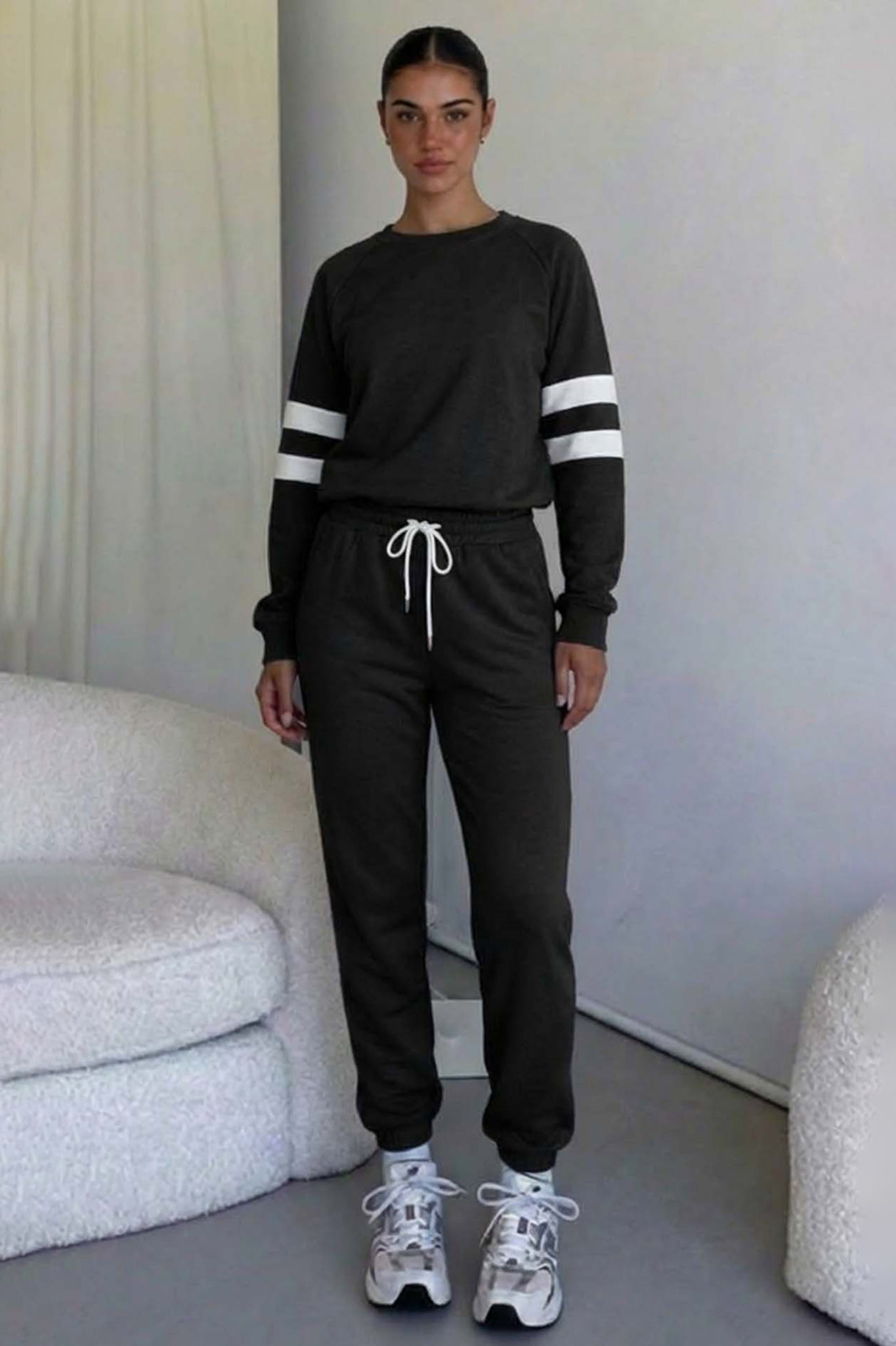 Σετ φόρμας το οποίο αποτελείται από μπλούζα με στρογγυλή λαιμόκοψη και ρίγες στα μανίκια, και παντελόνι με λάστιχο και κορδόνι στη μέση για τέλεια εφαρμογή.