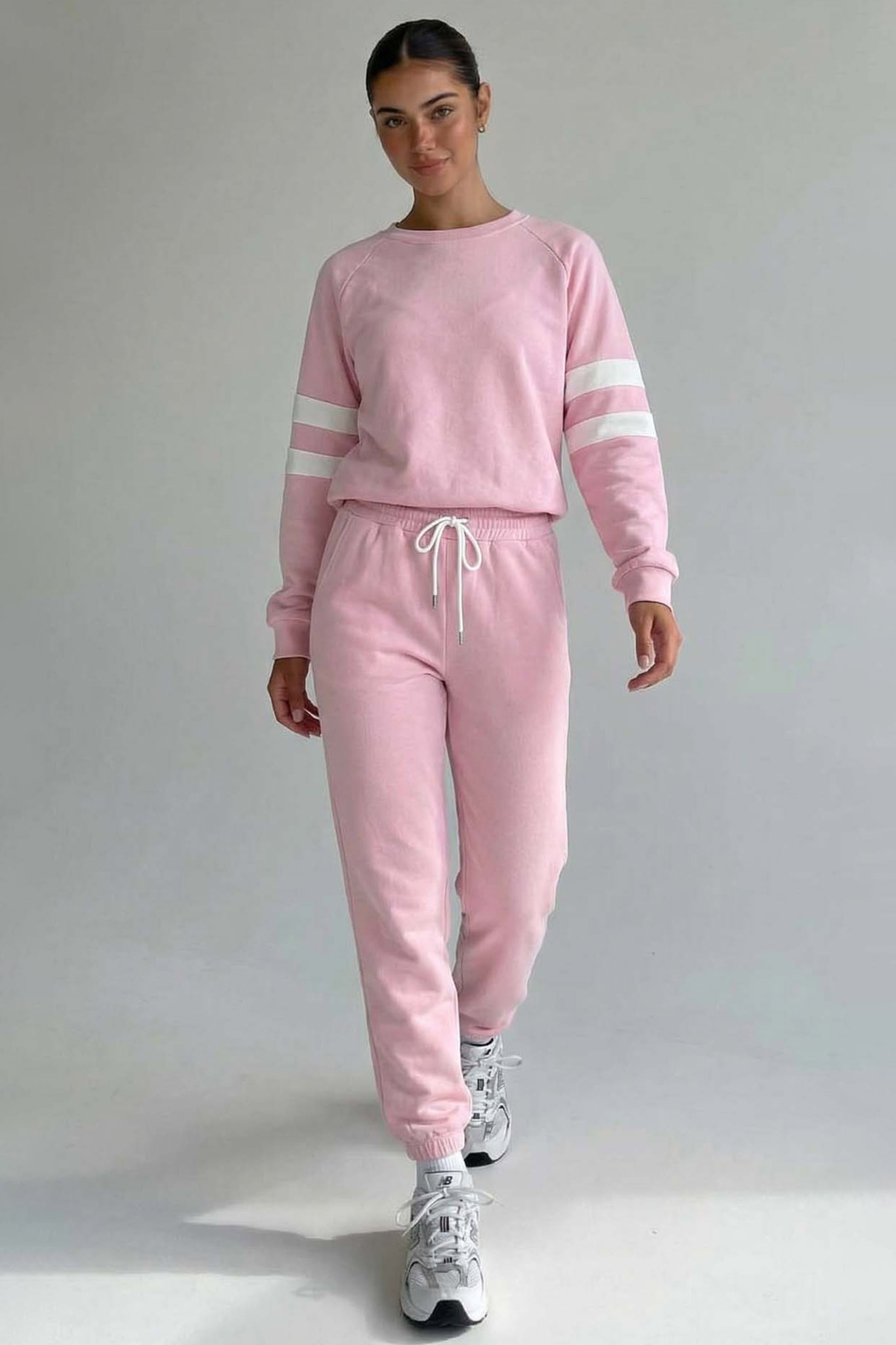 Σετ φόρμας το οποίο αποτελείται από μπλούζα με στρογγυλή λαιμόκοψη και ρίγες στα μανίκια, και παντελόνι με λάστιχο και κορδόνι στη μέση για τέλεια εφαρμογή.