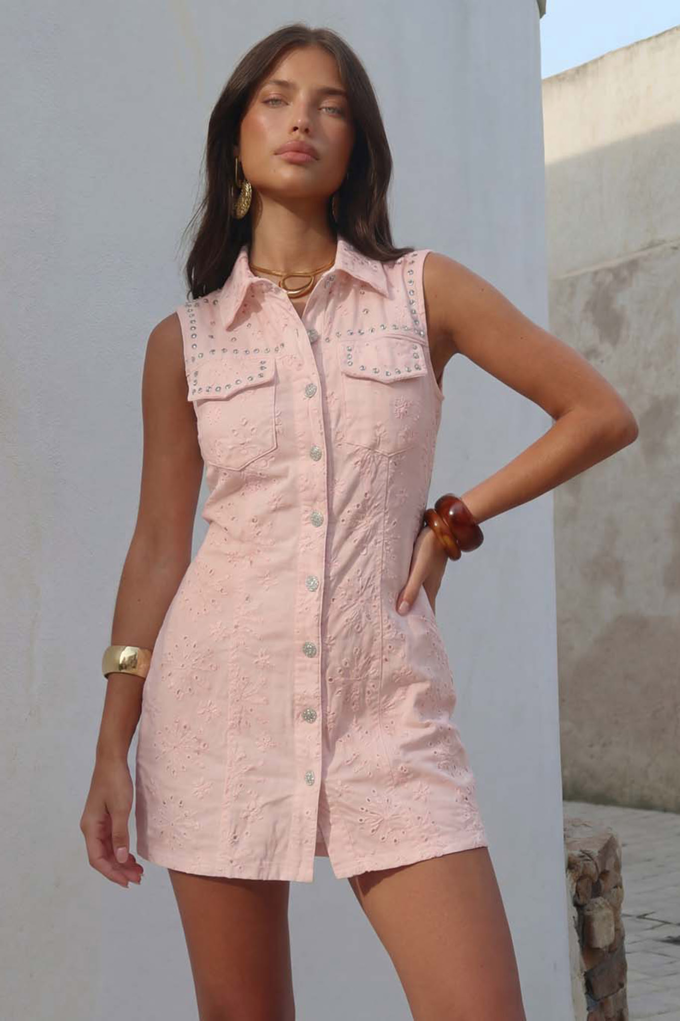 Αμάνικο shirt-dress με κλασικό γιακά και κλείσιμο με κουμπιά σε όλο το μήκος της μπροστινής πλευράς. Διαθέτει slim fit γραμμή που αναδεικνύει τη σιλουέτα, προσφέροντας παράλληλα άνεση.