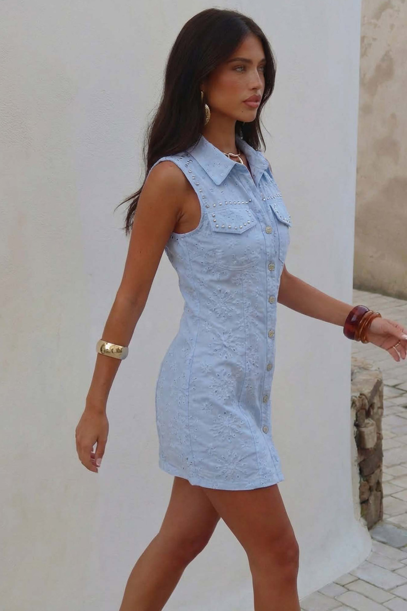 Αμάνικο shirt-dress με κλασικό γιακά και κλείσιμο με κουμπιά σε όλο το μήκος της μπροστινής πλευράς. Διαθέτει slim fit γραμμή που αναδεικνύει τη σιλουέτα, προσφέροντας παράλληλα άνεση.