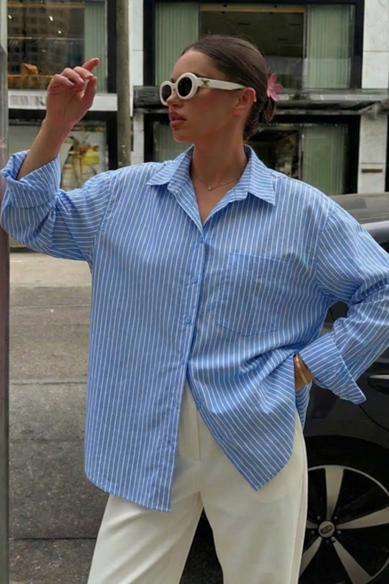 Ριγέ πουκάμισο, ένα διαχρονικό κομμάτι με μοντέρνα oversized γραμμή που προσφέρει άνεση και στυλ. Είναι κατασκευασμένο από αεράτο βαμβακερό ύφασμα, διαθέτει κλασικό γιακά, μακριά μανίκια με μανσέτες και τσέπη στο στήθος.
