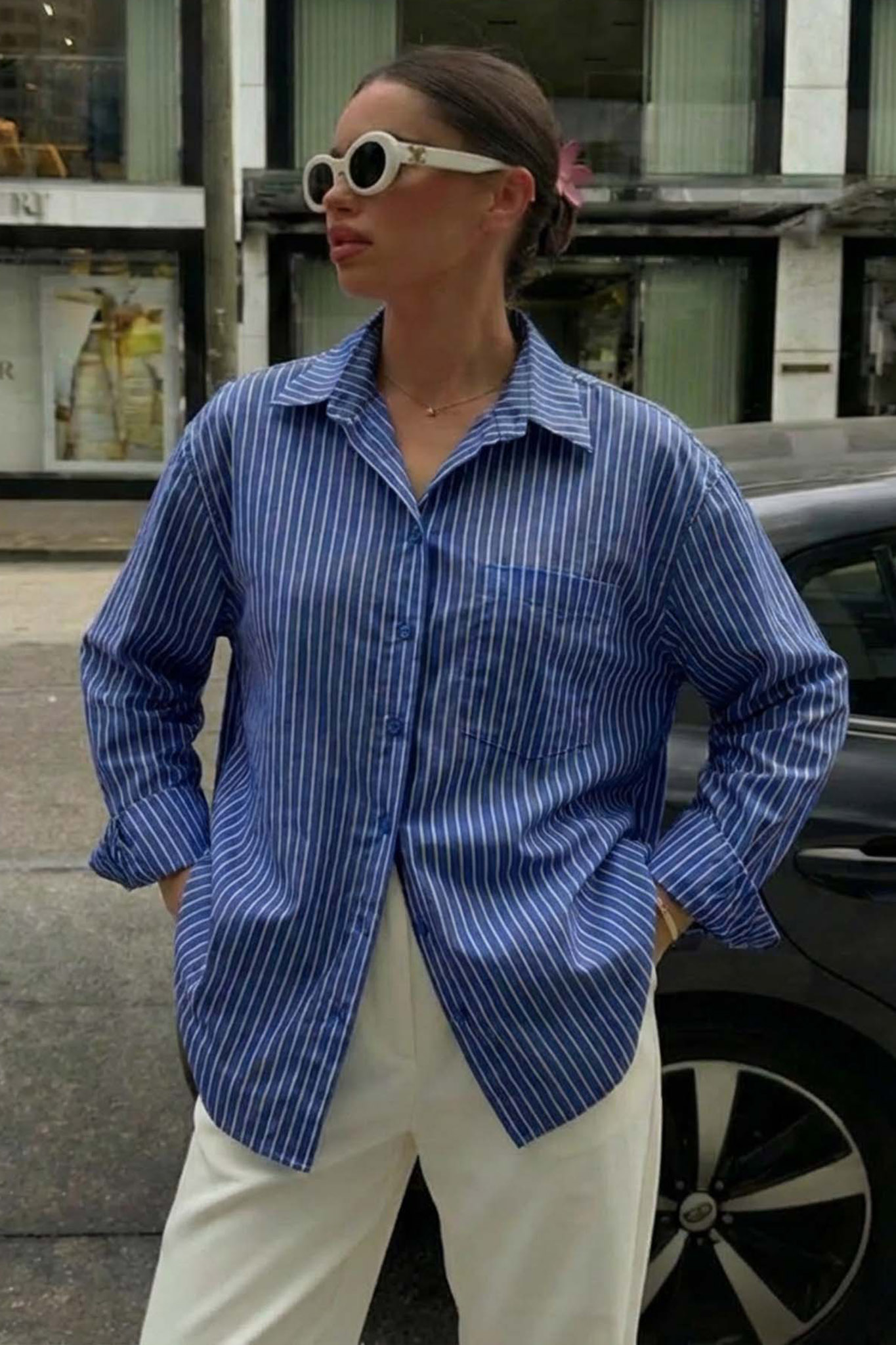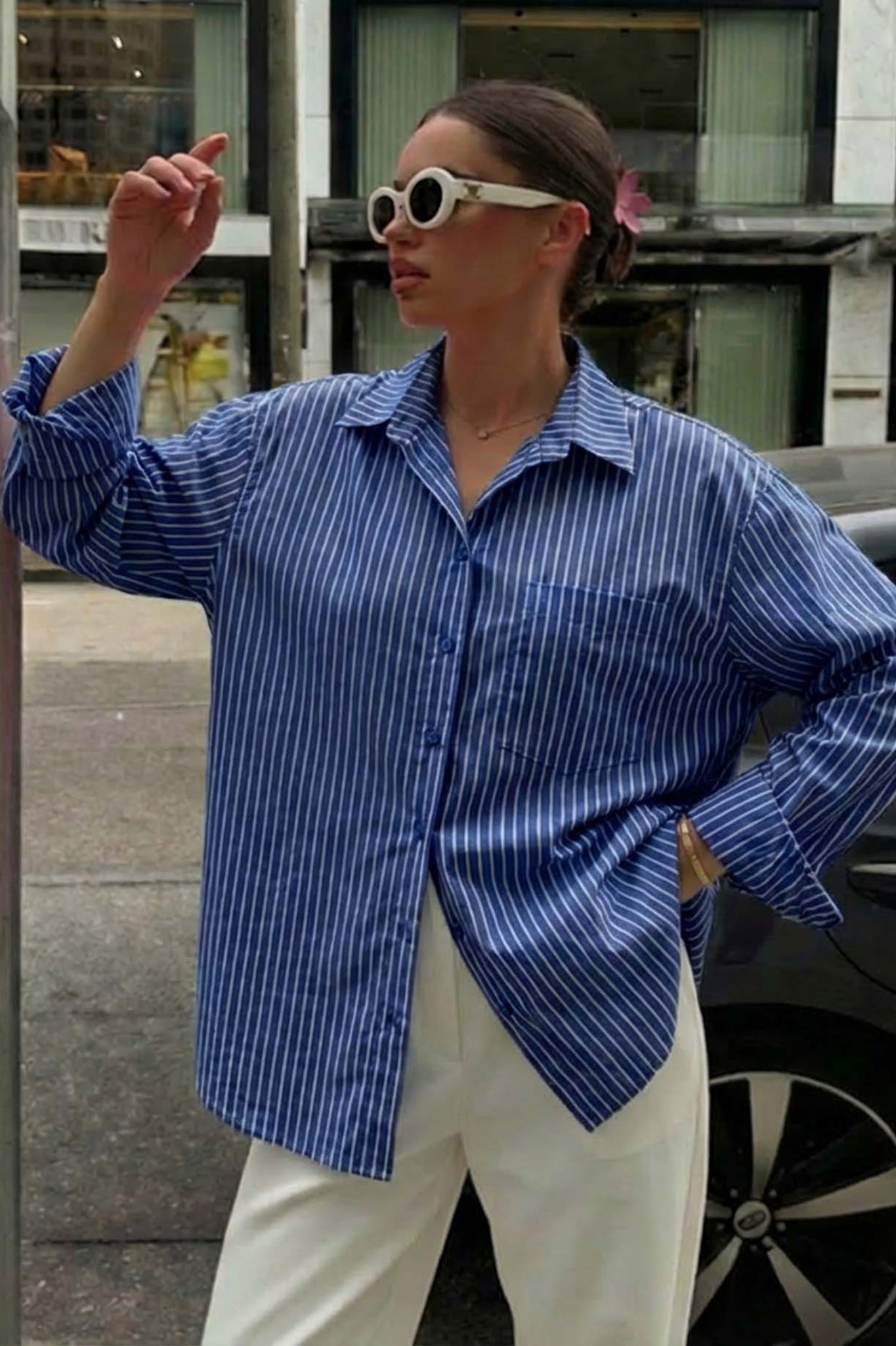 Ριγέ πουκάμισο, ένα διαχρονικό κομμάτι με μοντέρνα oversized γραμμή που προσφέρει άνεση και στυλ. Είναι κατασκευασμένο από αεράτο βαμβακερό ύφασμα, διαθέτει κλασικό γιακά, μακριά μανίκια με μανσέτες και τσέπη στο στήθος.