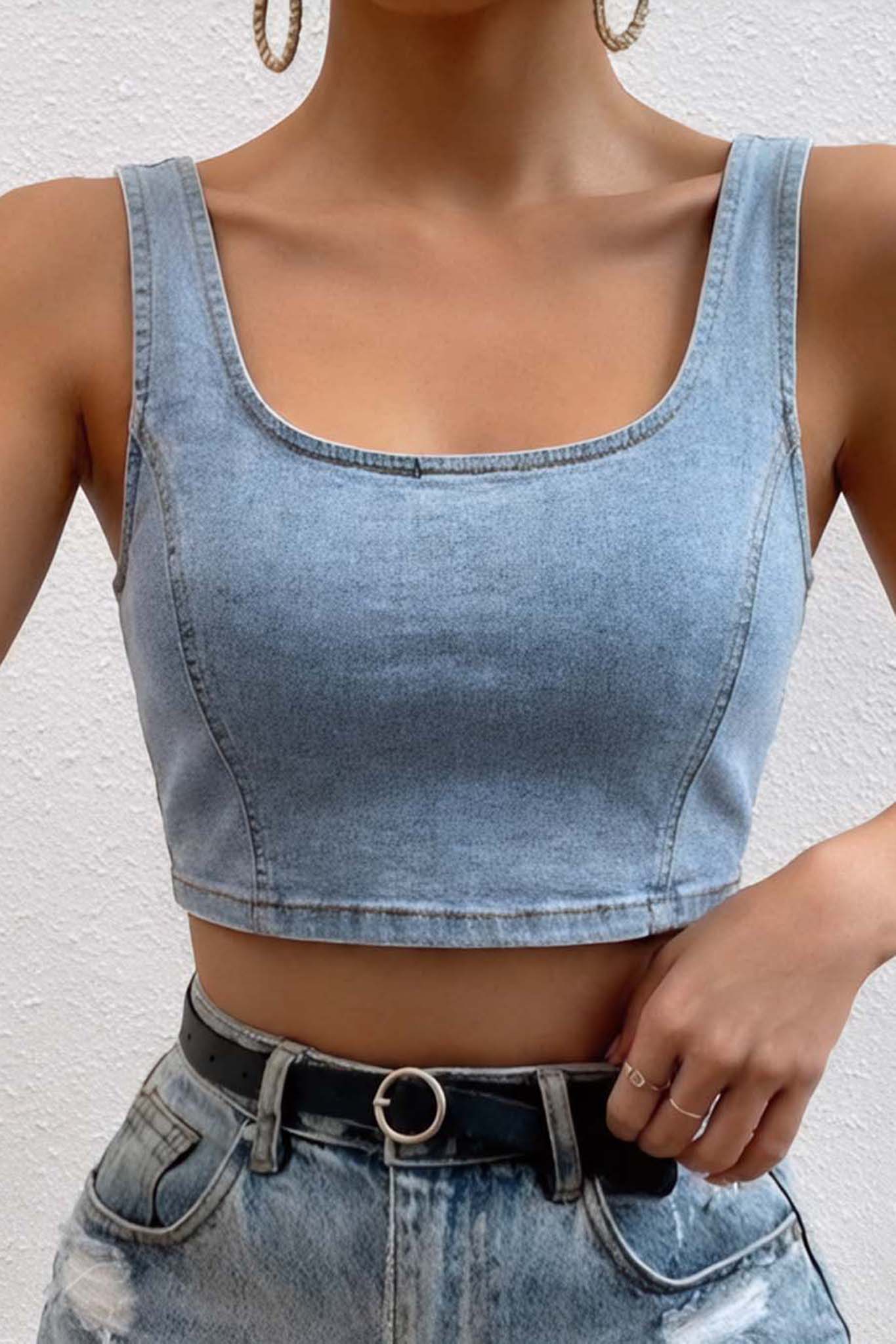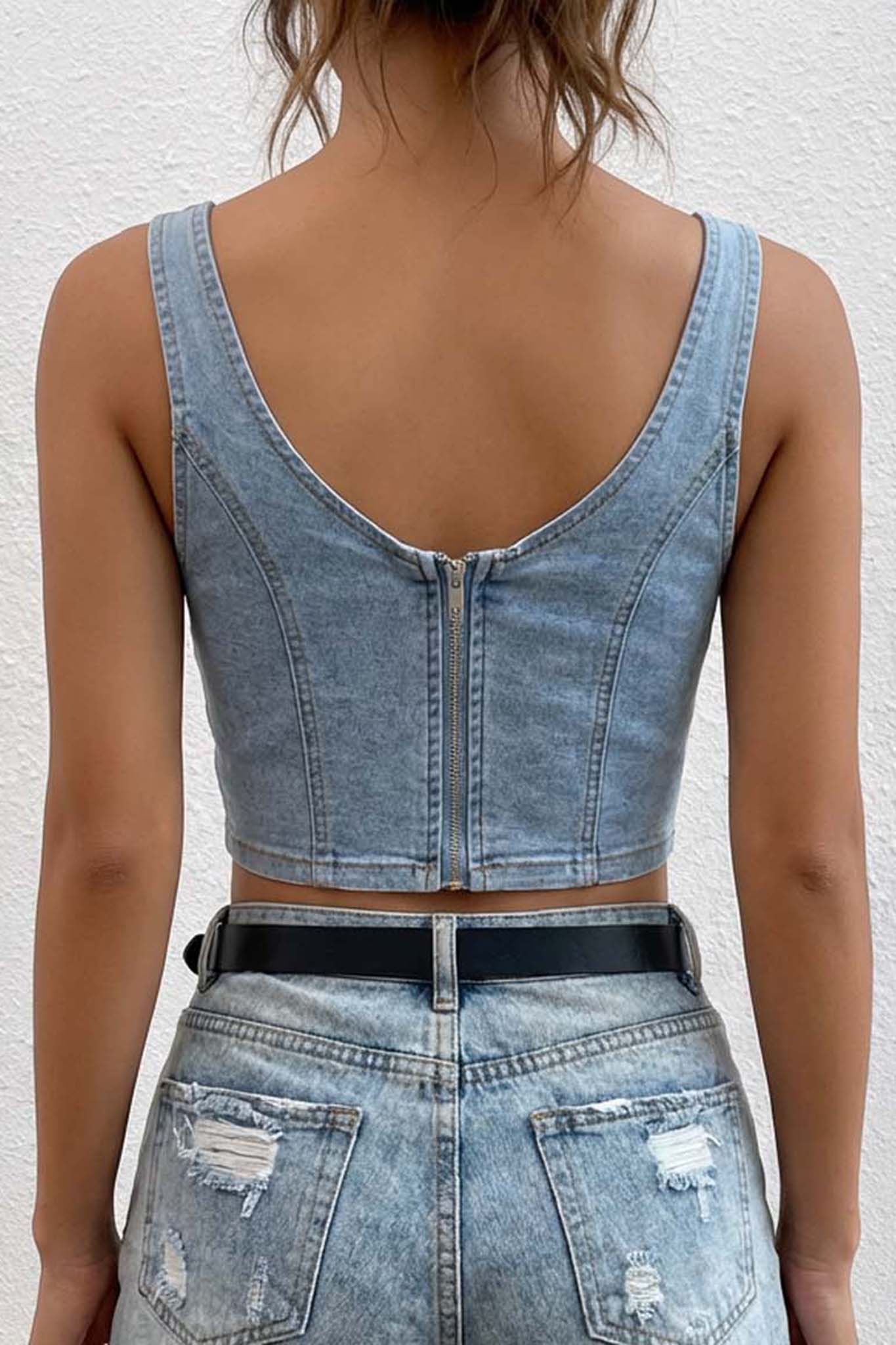 Αμάνικο crop top σε στυλ κορσέ με τετράγωνη λαιμόκοψη και κάθετες ραφές που κολακεύουν τη σιλουέτα, συνδυάζει την αισθητική των 90s με μια μοντέρνα, θηλυκή γραμμή.