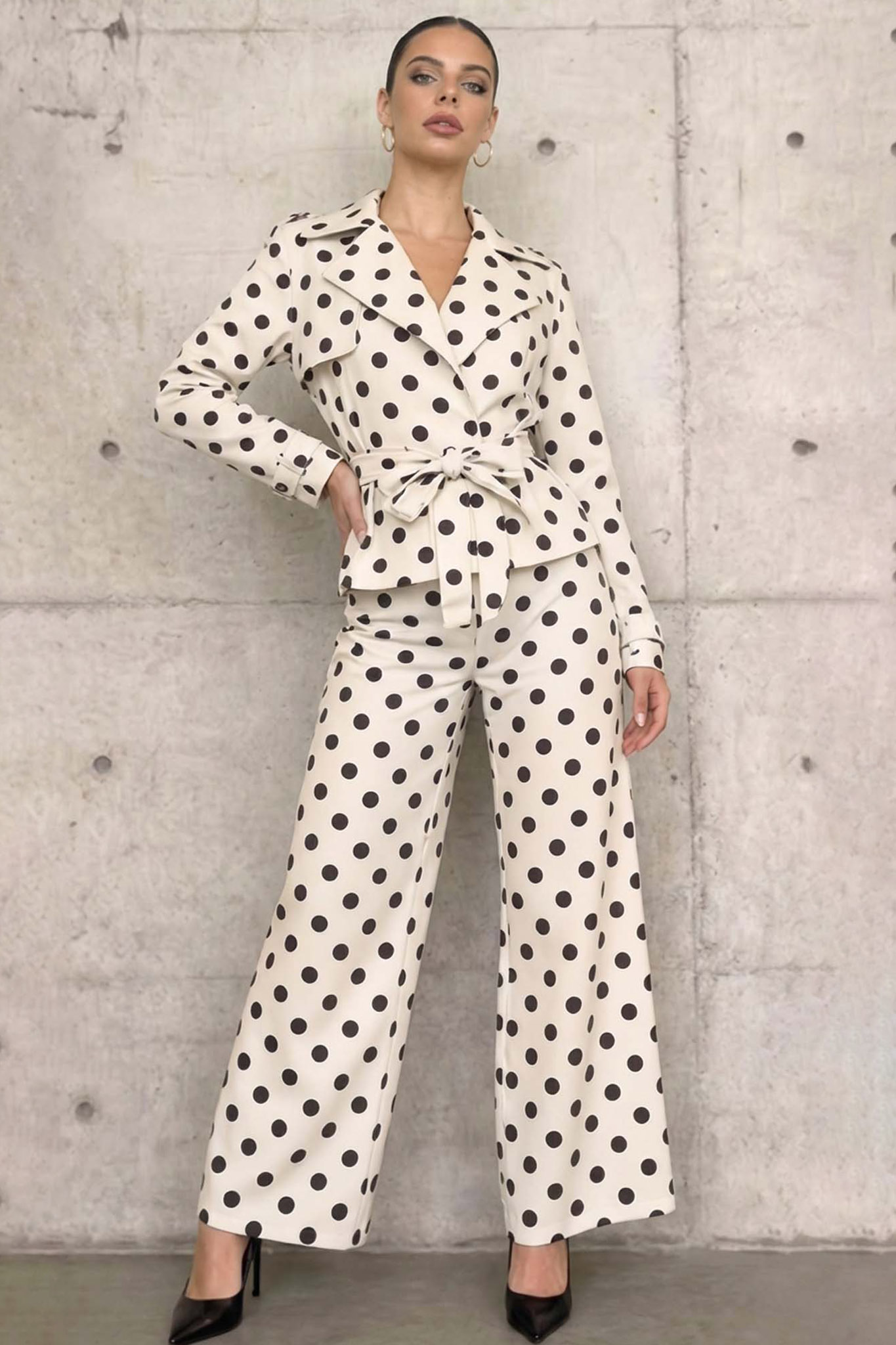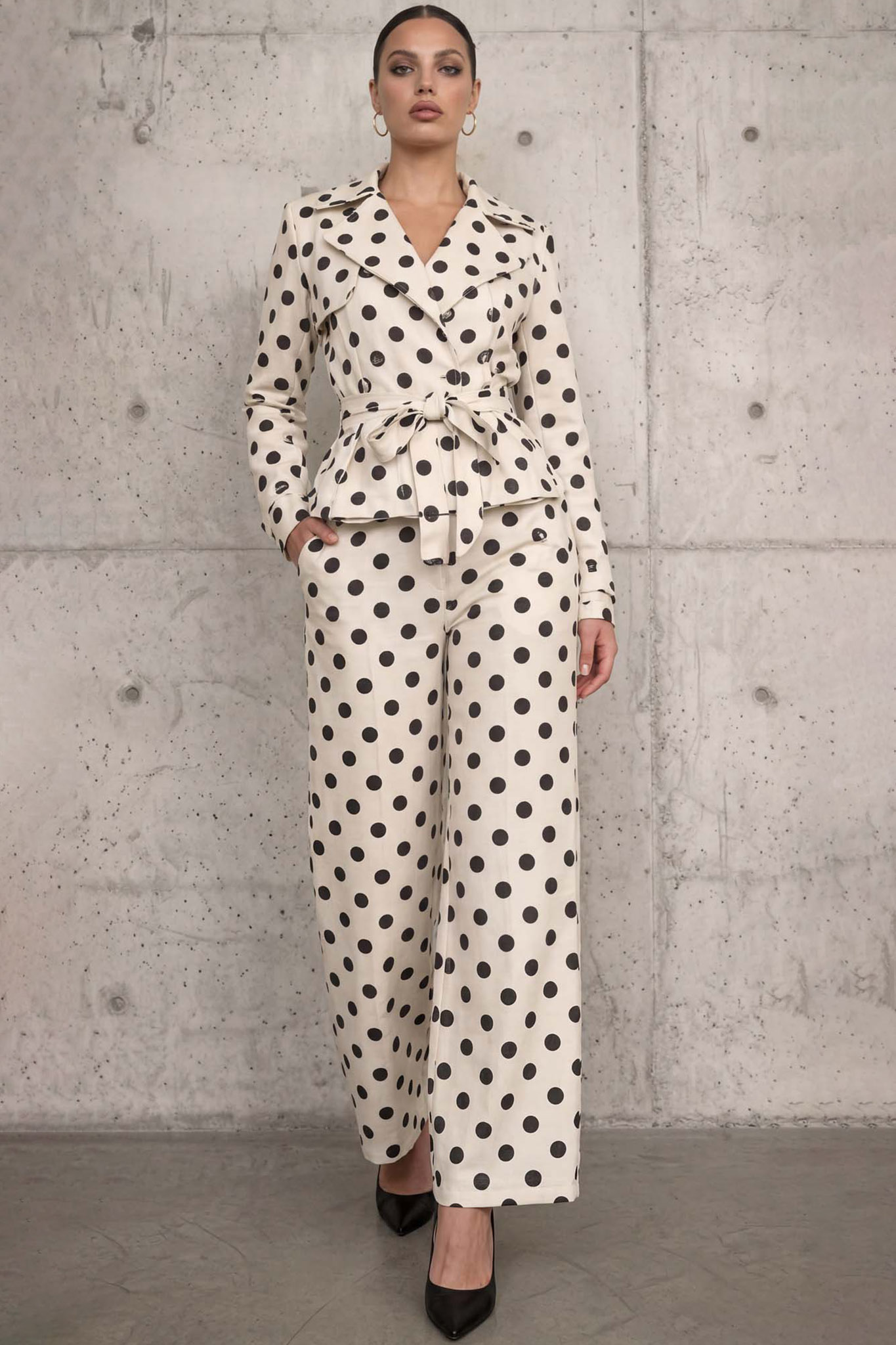 Σετ σακάκι με παντελόνι πουά με ζωνάκι στη μέση για να αναδεικνύει τη σιλουέττα. Ιδανικό για να φορεθεί από το πρωί μέχρι το βράδυ.