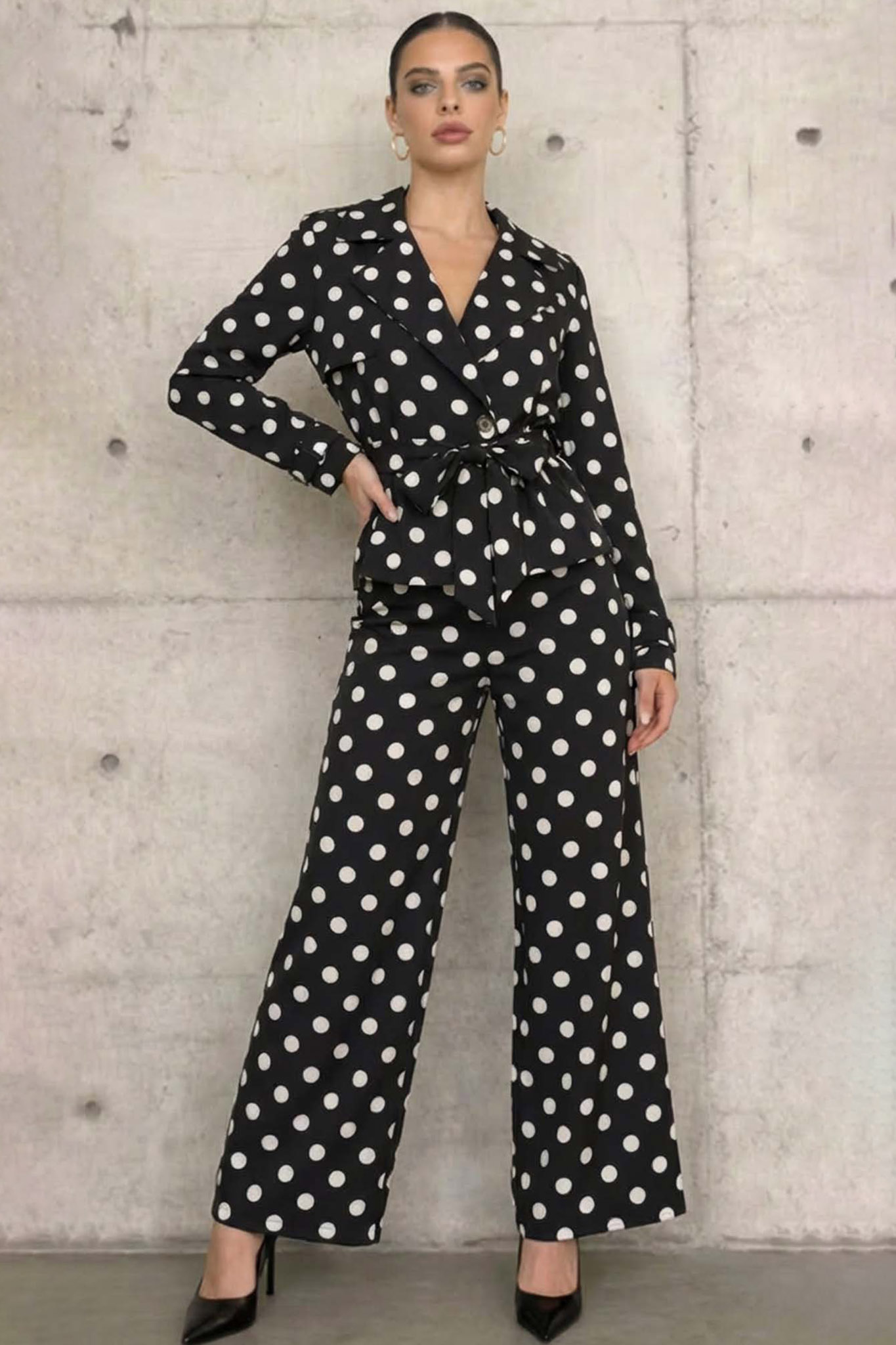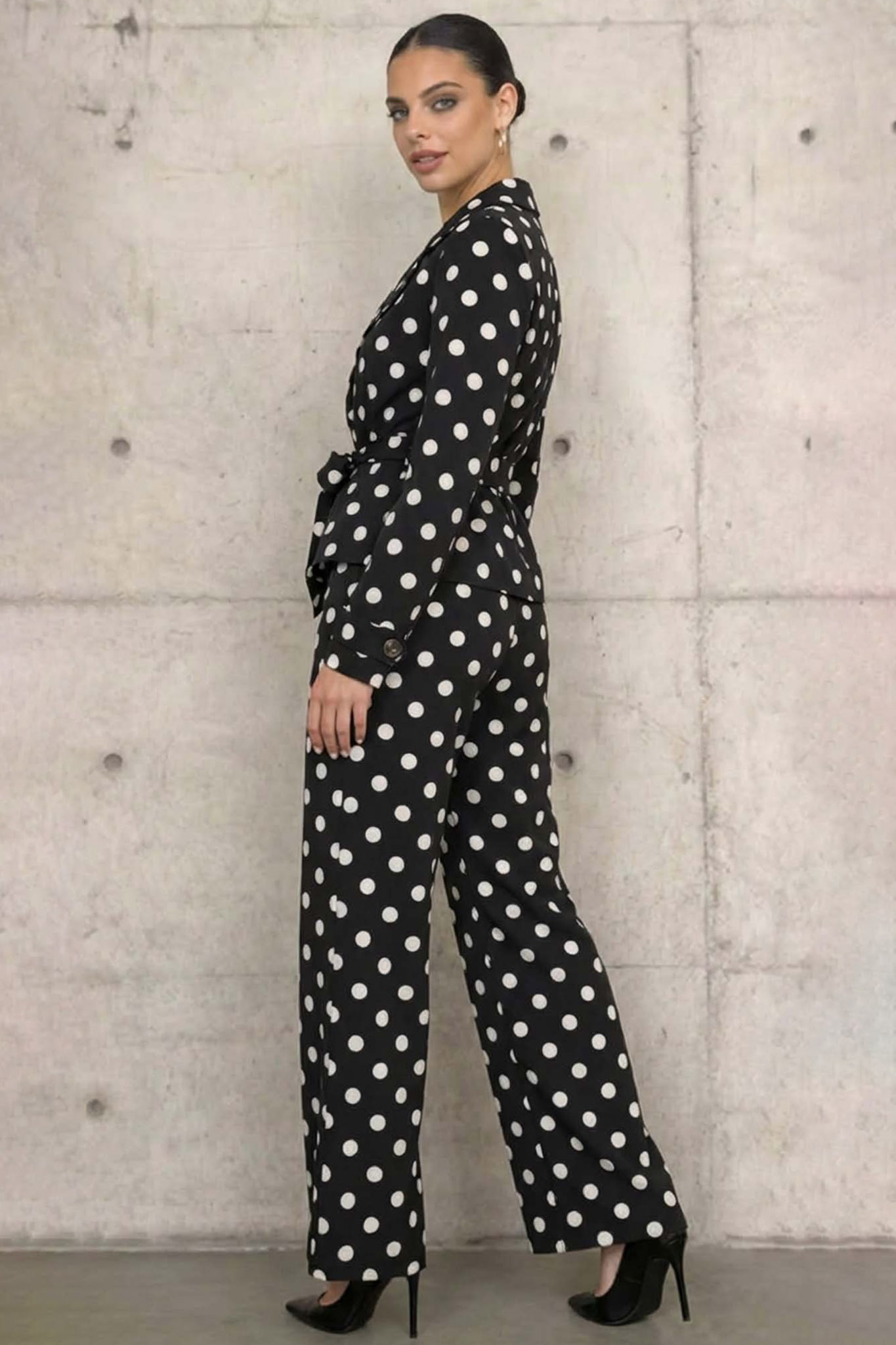 Σετ σακάκι με παντελόνι πουά με ζωνάκι στη μέση για να αναδεικνύει τη σιλουέττα. Ιδανικό για να φορεθεί από το πρωί μέχρι το βράδυ.