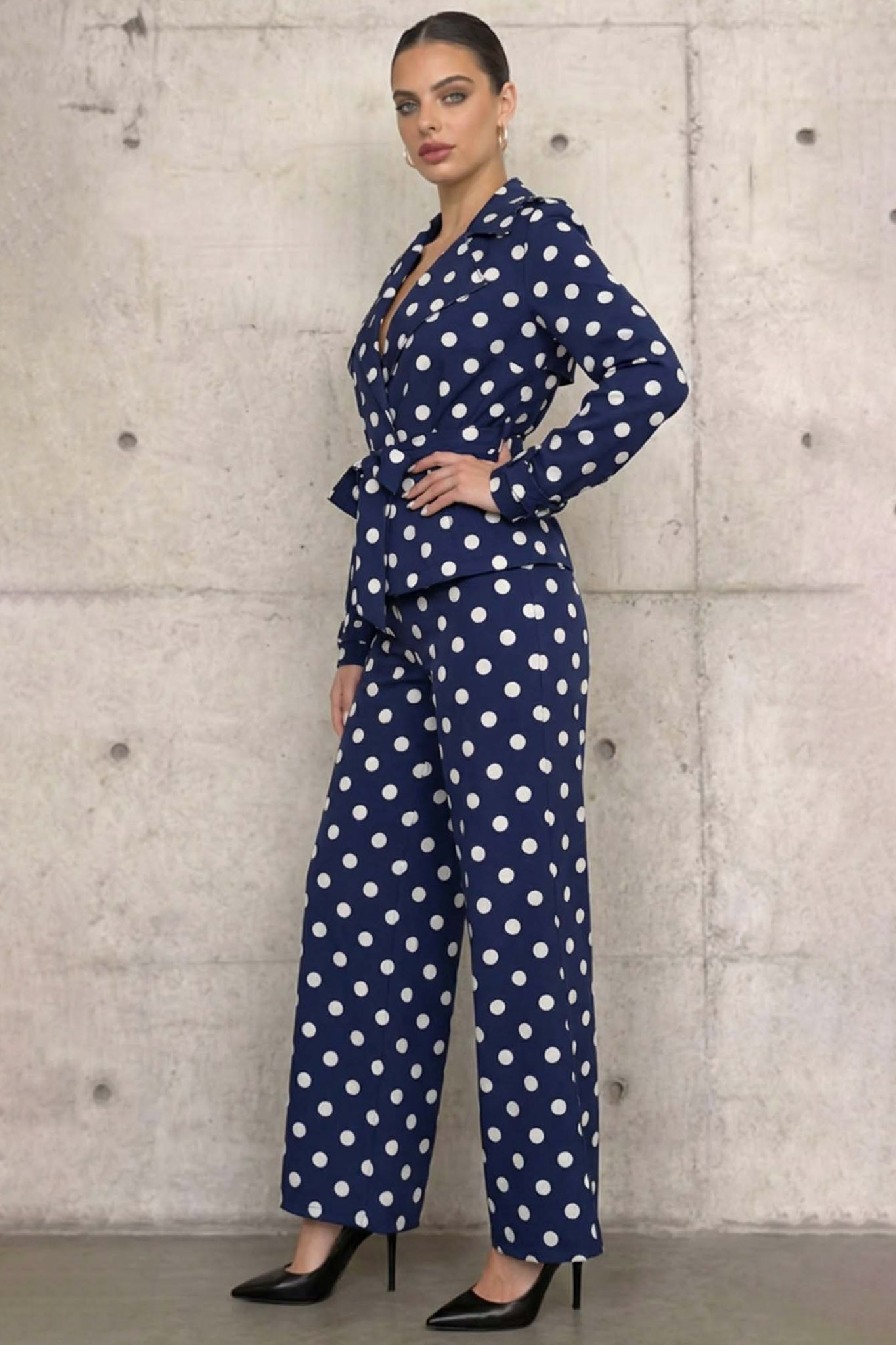Σετ σακάκι με παντελόνι πουά με ζωνάκι στη μέση για να αναδεικνύει τη σιλουέττα. Ιδανικό για να φορεθεί από το πρωί μέχρι το βράδυ.