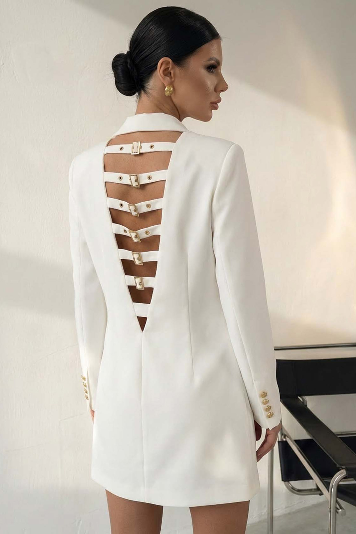 Blazer Dress με Ανοιχτή Πλάτη. Το εντυπωσιακό άνοιγμα στην πλάτη διακοσμείται από πολλαπλά οριζόντια λουράκια με μεταλλικές αγκράφες, προσδίδοντας έναν σύγχρονο χαρακτήρα στο look