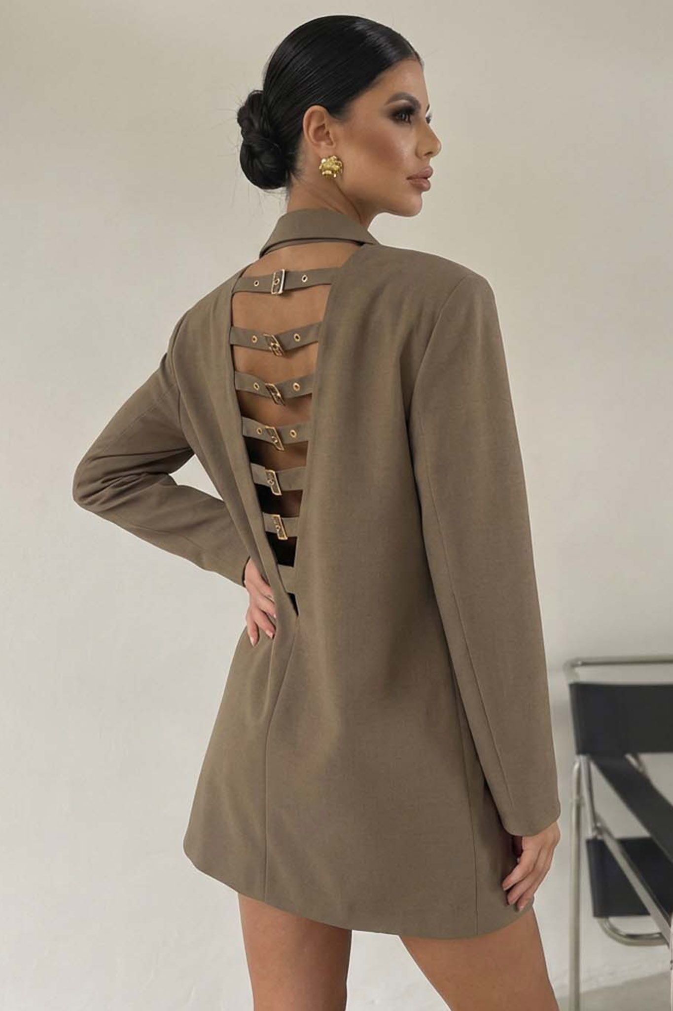 Blazer Dress με Ανοιχτή Πλάτη. Το εντυπωσιακό άνοιγμα στην πλάτη διακοσμείται από πολλαπλά οριζόντια λουράκια με μεταλλικές αγκράφες, προσδίδοντας έναν σύγχρονο χαρακτήρα στο look