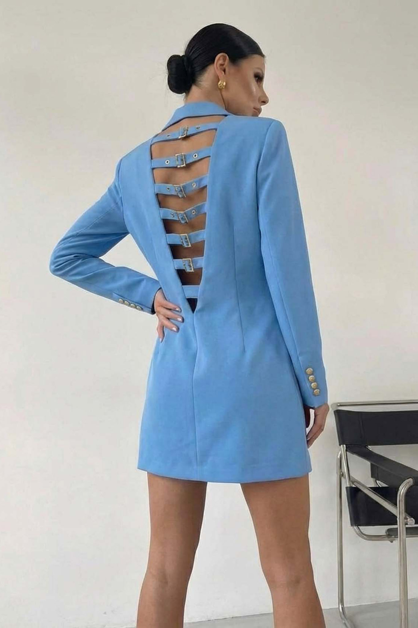 Blazer Dress με Ανοιχτή Πλάτη. Το εντυπωσιακό άνοιγμα στην πλάτη διακοσμείται από πολλαπλά οριζόντια λουράκια με μεταλλικές αγκράφες, προσδίδοντας έναν σύγχρονο χαρακτήρα στο look